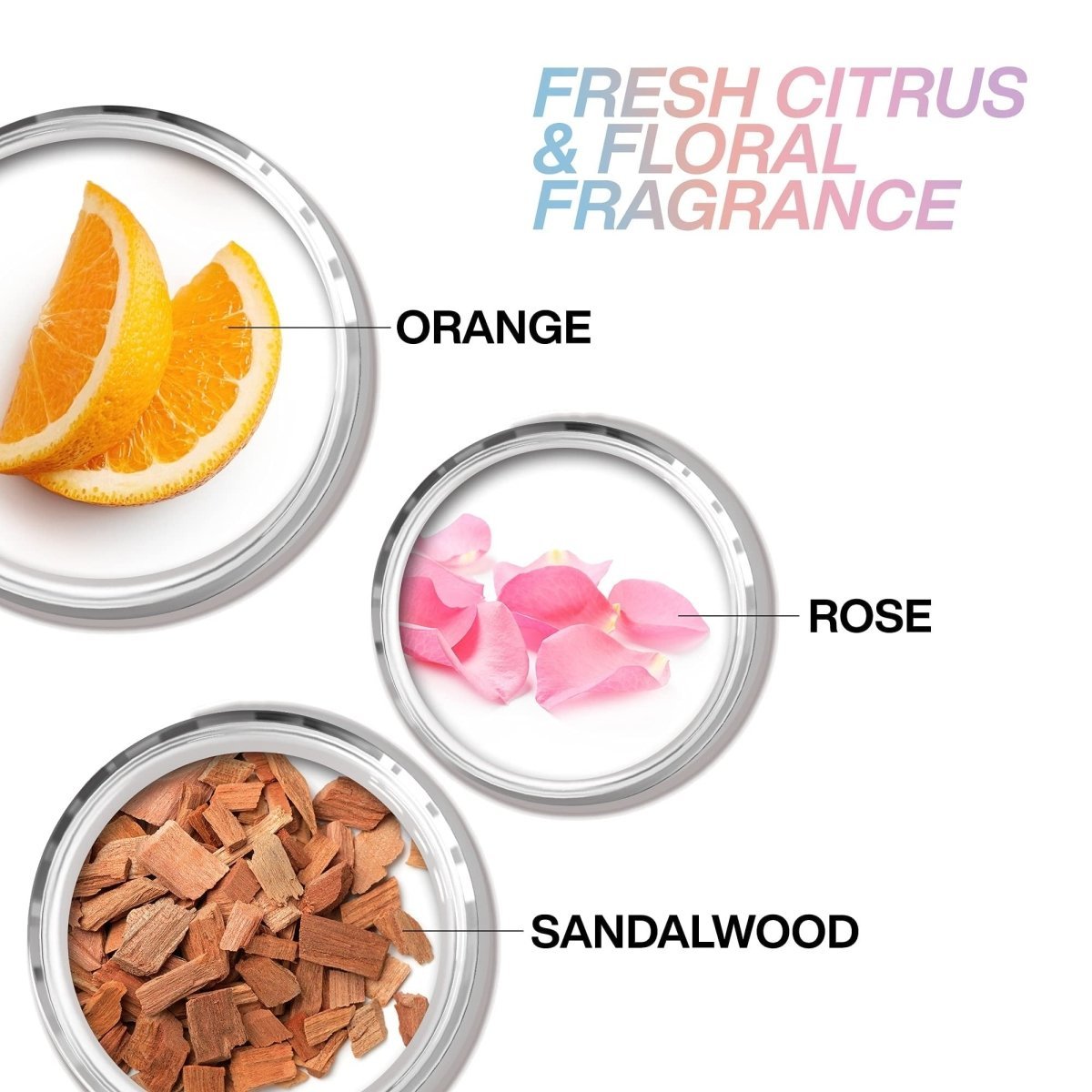 The shampoo features a refreshing citrus and floral fragrance with top notes of orange, bergamot, and marine, complemented by middle notes of freesia, peach, and rose, and finishing with warm cedarwood, sandalwood, and amber.