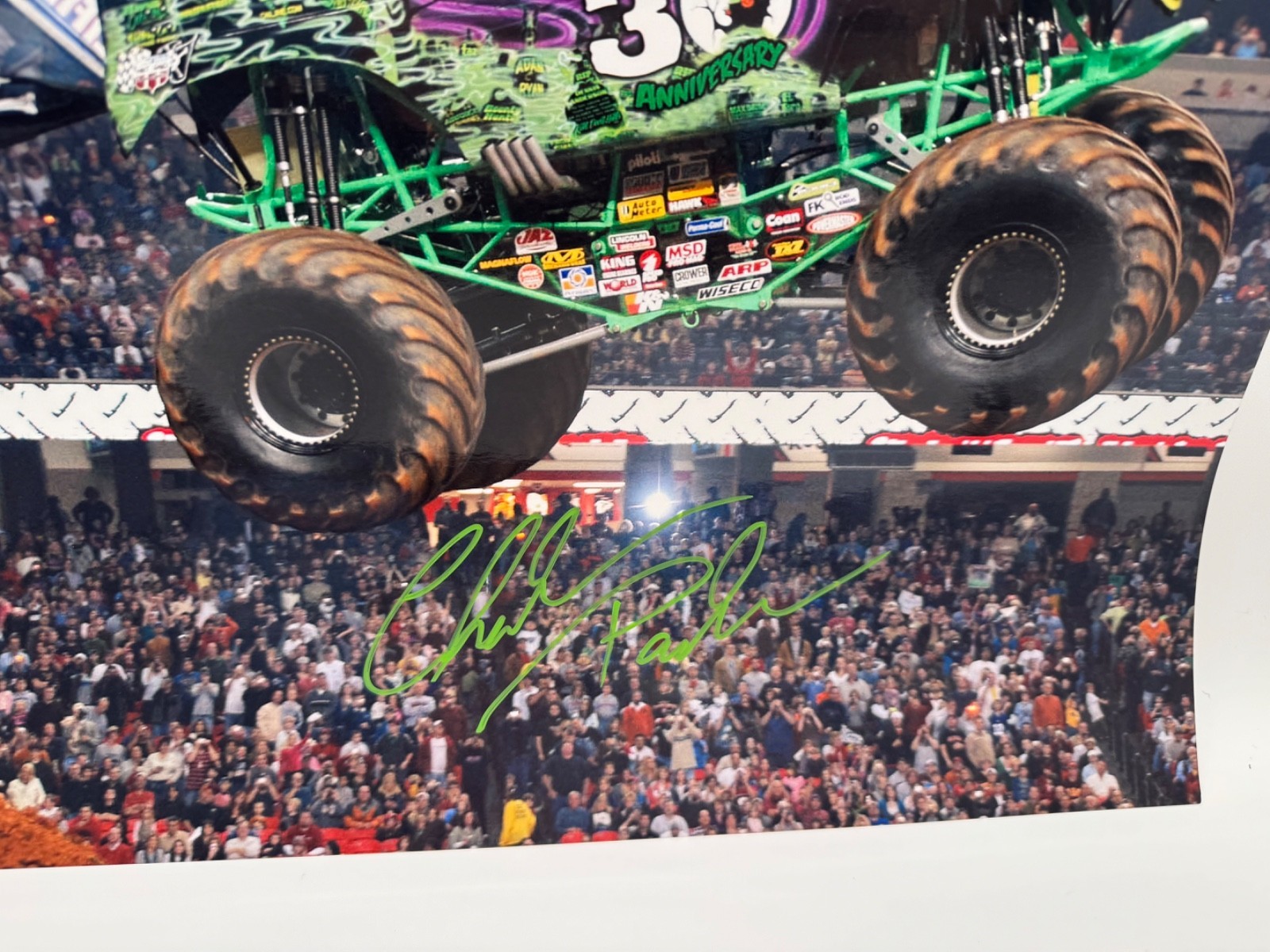 The product is an 11x14 signed photo of Grave Digger Monster Jam Truck driver Charlie Pauken. This autographed photo is an original piece of entertainment memorabilia, showcasing the signature of the celebrity. Perfect for fans of Monster Jam or collectors of autographed memorabilia, this unique item captures a piece of history from the world of professional truck racing.