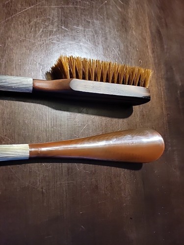 The shoe horn and brush are designed for adult unisex shoes and are an original item. They are not modified and have been well-maintained over the years. This set is a great addition to any vintage accessories collection and is sure to impress.