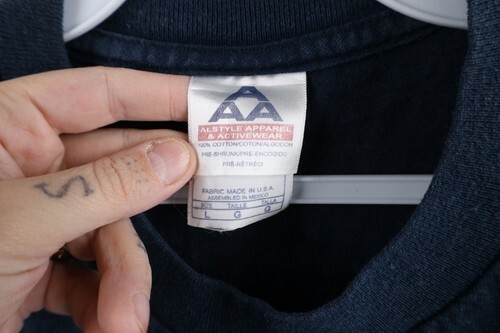 Hole collar. Blemishes front, shoulders, back, left arm. Collar, arms, shoulders discolored. Graphics cracking, faded. Color faded. Pilling