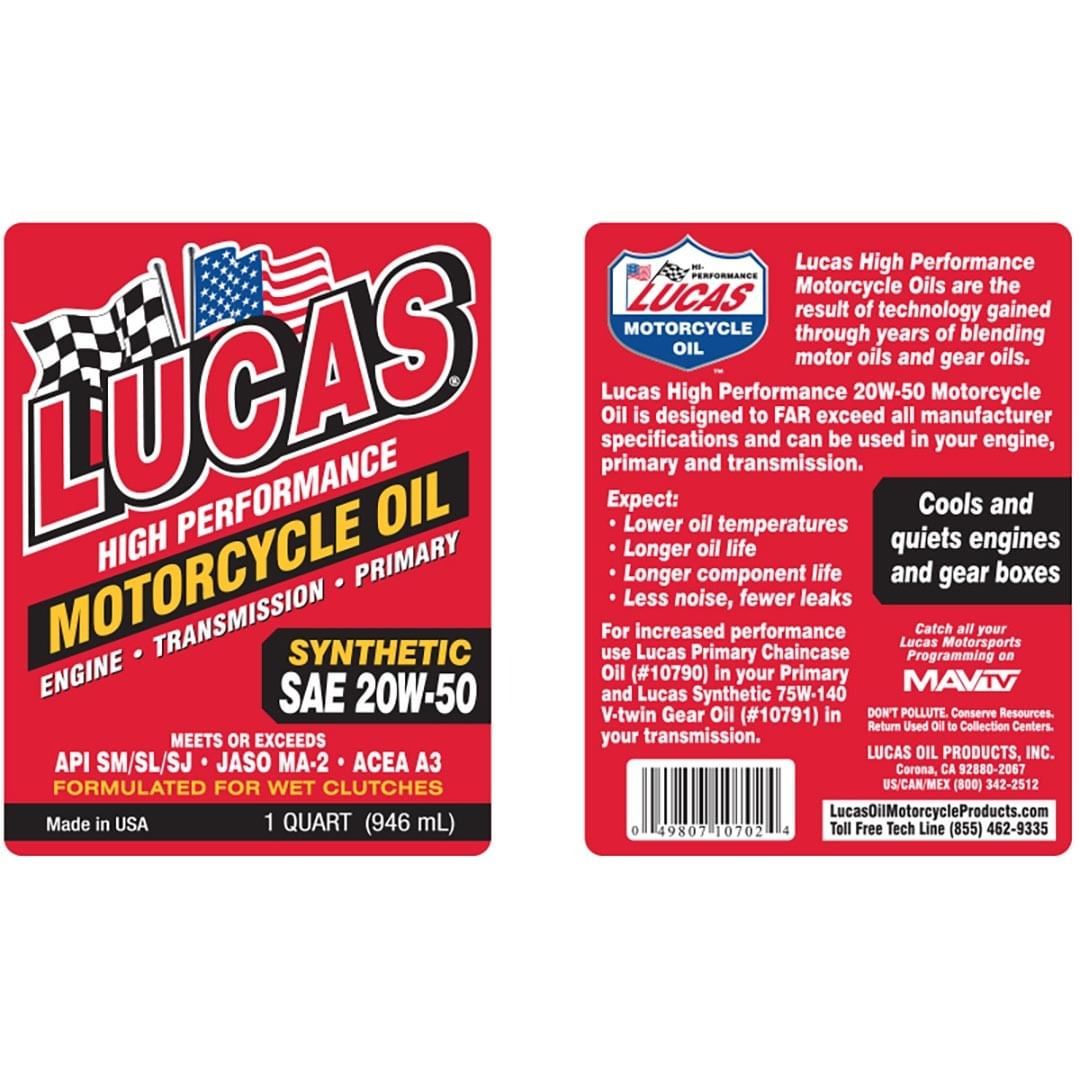 Lucas Synthetic SAE 20W-50 High Performance Motorcycle Oil is formulated to lower engine temperature and raise oil pressure, reduce noise and increase performance. It offers maximum protection with minimum drag.