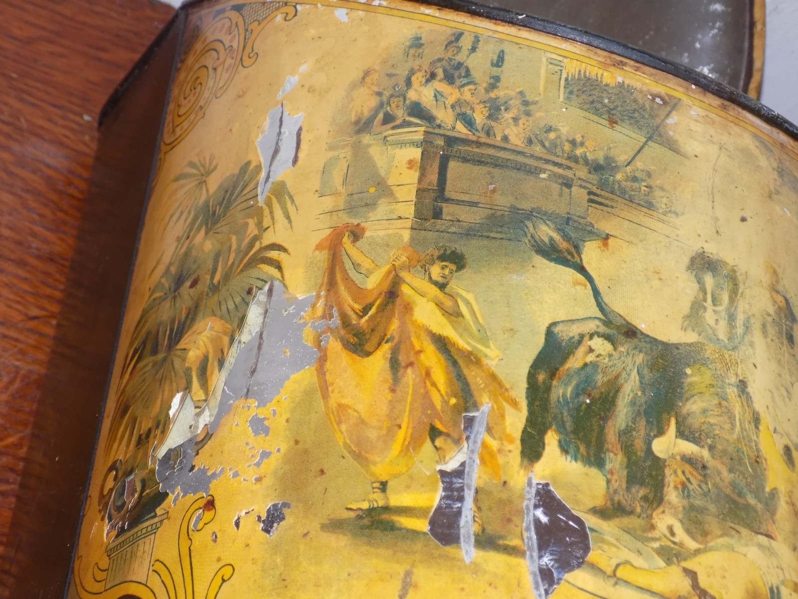 Tin has wear, scuffs, scratches, dings, dents, paint loss and flaking in spots