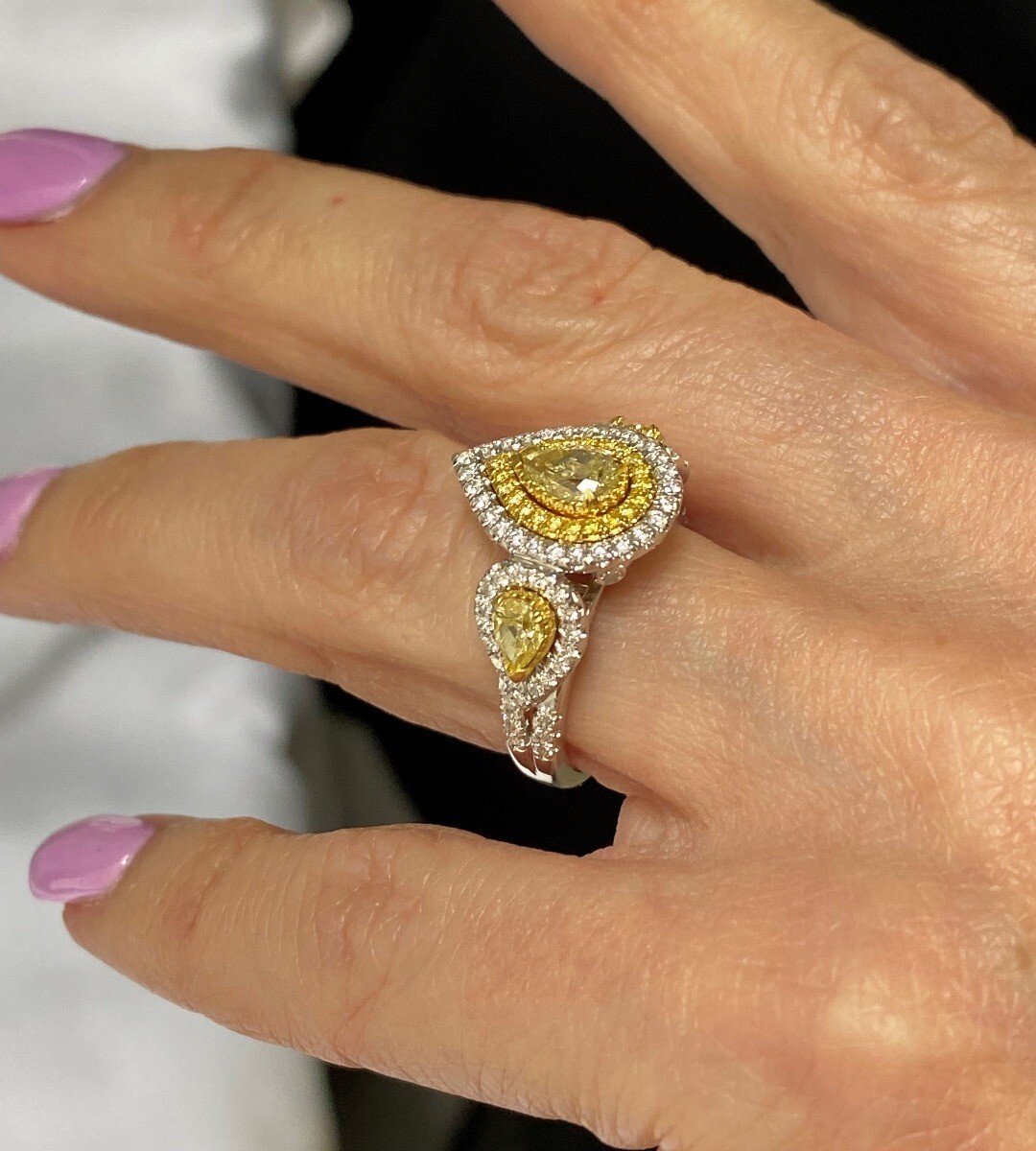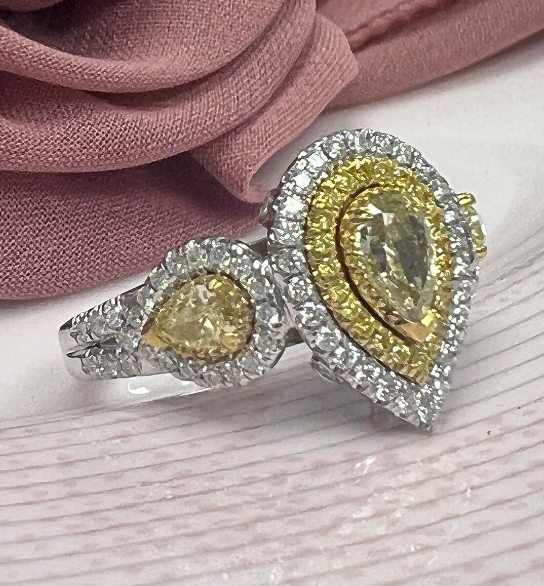 El exquisito anillo de diamantes de Deco Design ofrece un impresionante centro de diamantes de diamante de color amarillo claro con forma de pera con forma de pera con forma de pera de 0.57 quilates, rodeado por un doble halo de diamantes de corte redondo amarillo e incoloro. El vastago dividido con dos lados naturales de diamantes con forma de pera de color amarillo claro completa completan un diseño y agrega una elegancia adicional a este anillo. Hecho a mano en oro de dos tonos de 18 quilates. El anillo viene con el Certificado del Instituto Gemologico de America GIA #6224284022. El peso total de quilates es de 1.93 quilates.