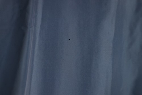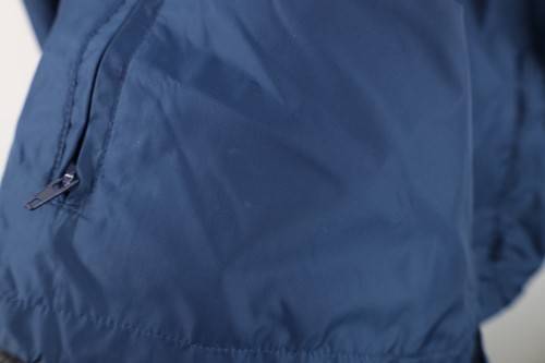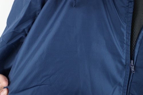 Cuffs stretched. Hole back. Blemishes/dark spots throughout. Hood, cuffs, inner lining discolored. Color faded. String distressed
