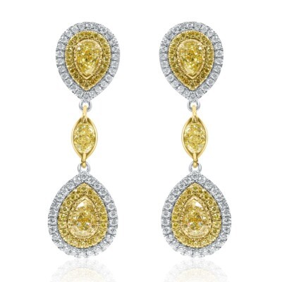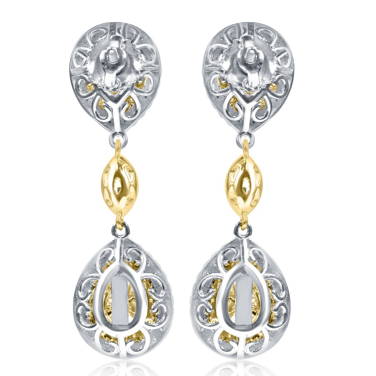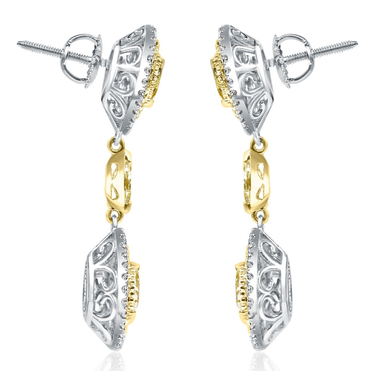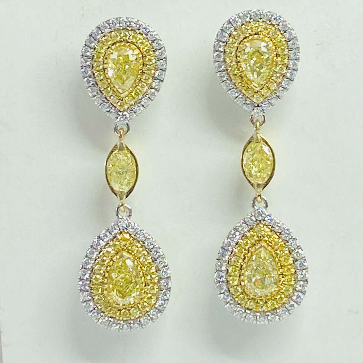¡Este espectacular aretes amable agregara magia al momento especial! Estos pendientes de caída colgante cuentan con piedras centrales de diamantes amarillas naturales de 1.36 ct de pera, rodeadas por un halo doble de diamantes de corte redondo incoloro y amarillo en micro pavimento con diamante amarillo elegante de corte ovalado. Hecho a mano en oro de dos tonos de 18k. El peso total del quilates es de 2.93 quilates. Los pendientes se aseguran con el cierre del tornillo.