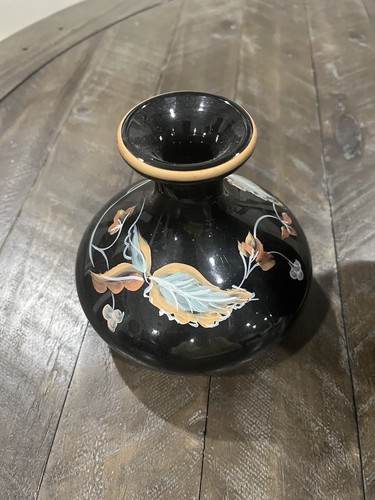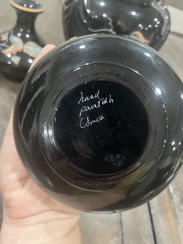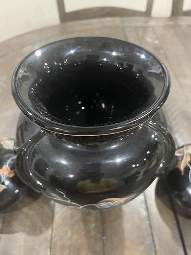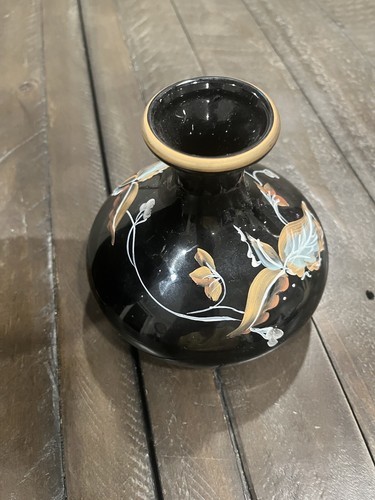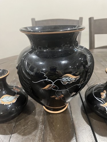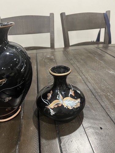 This stunning vase set features a beautiful hand-painted autumn leaf pattern on a glossy black glass surface. One piece is signed by renowned artist Dane Fredrick and is an original production style art glass by Fenton. With the large vase measuring 9-1/2 inches in height and 7 inches in width, this vintage vase set is perfect for displaying on a console or as a centerpiece on a table.