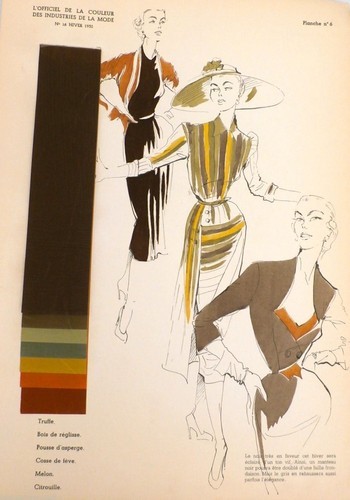 Vintage L'?Officiel de la Couleur French fashion design catalog page is rare and hand painted ( see below) and has a piece of attached ( though can be lifted) cellophane ( this one is missing the cellophane ) over colored paper intended to show the color choices of the material.These are extremely rare and would be beautiful framed in groups. Fab New Look suits in ?Truffle?, ?Melon?, and more?