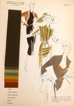 ?These are, in part, the comments from the original instructions from the publication in which these prints were found: "Pursuing its campaign for supreme Parisian elegance, L'?Officiel de la Couleur continues to be published in limited editions of numbered copies, which is the proper course for a publication which is not intended for the general public. L?Officiel de la Couleur is the first magazine in the world to be collected by bibliophiles. Each one of its colors, it will be remembered, is painted in by hand, and this is what gives it its value.?? ?Length: 14"??Width: 10"??Pages: 1?Issue Date: 1952, 16, 1