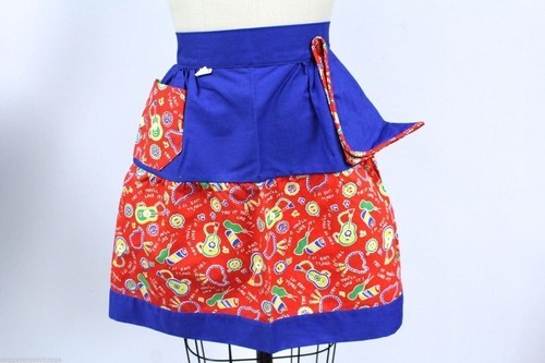 Adorable 1970s vintage apron, in 100% cotton with a pretty bright primary color print with a sort of Hawaiian picnic motif, complete with a ukelele. Also, "peace" signs give it that 1960s vibe. It has an attached matching pot holder?..never used. 18? at the waist, by 42? at hem x 18? long. Great gift for someone who has that vintage kitchen.