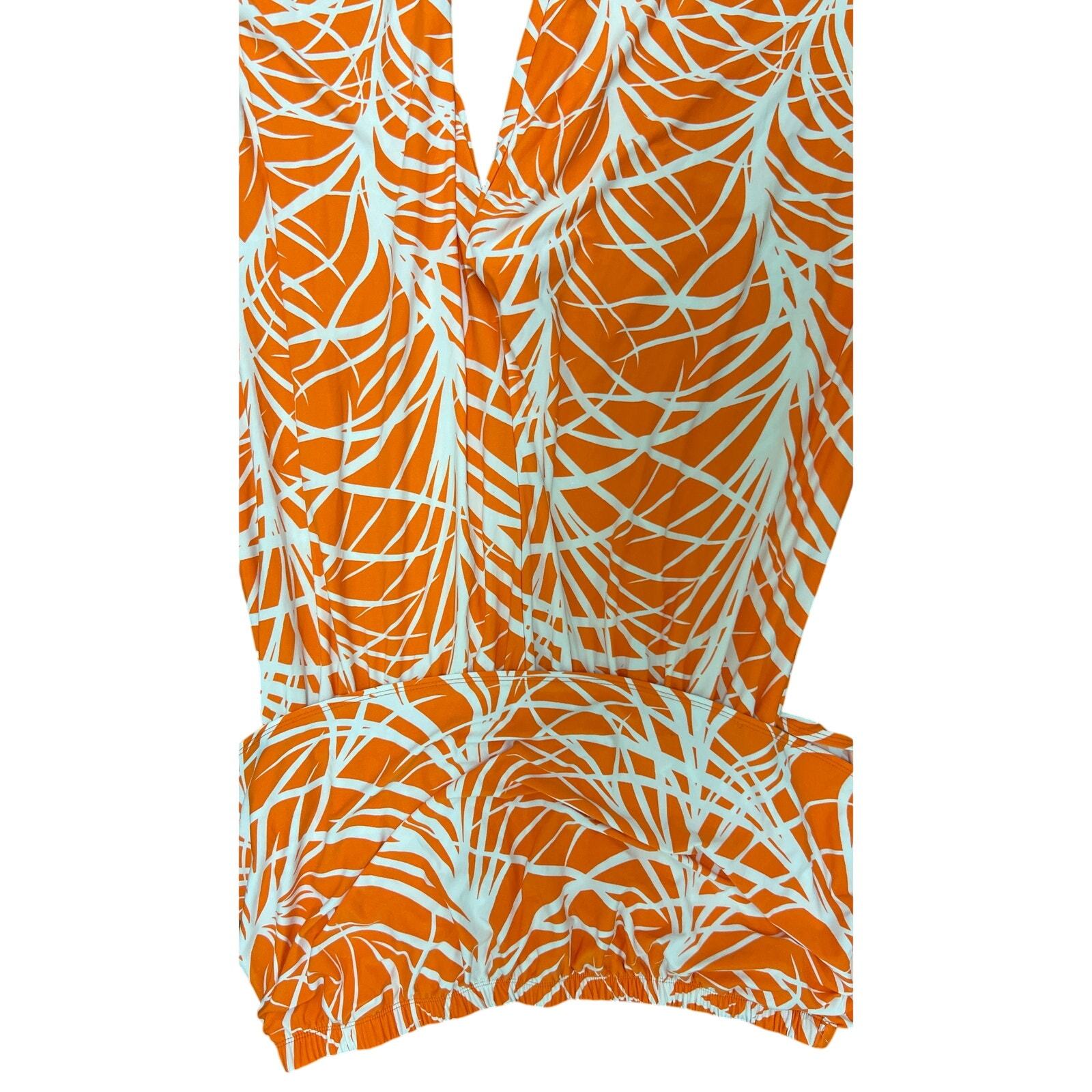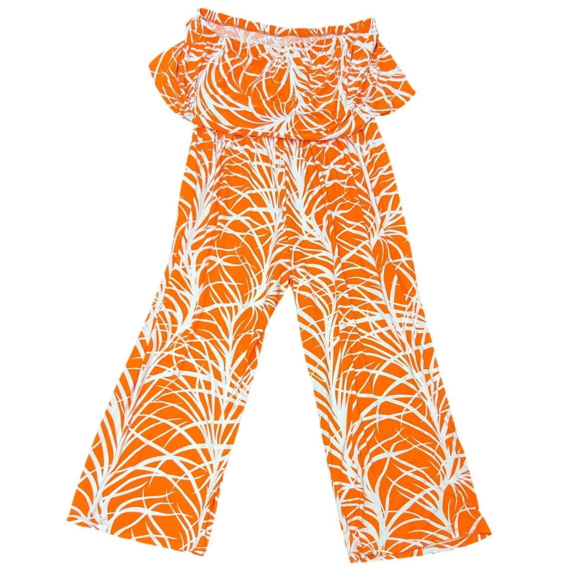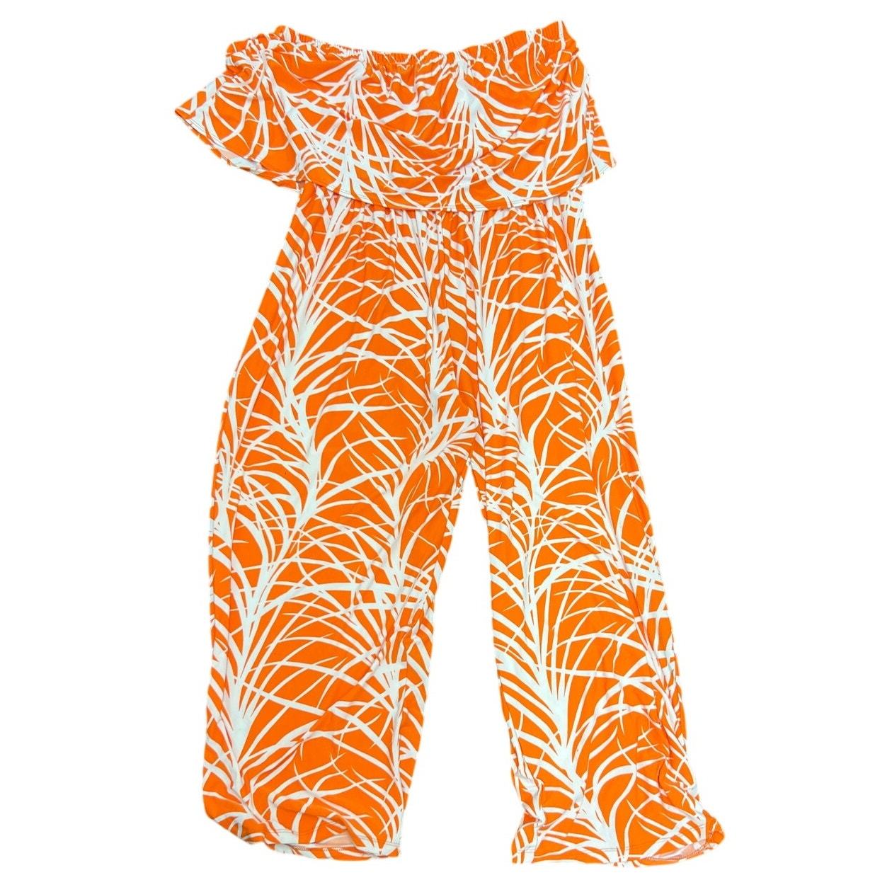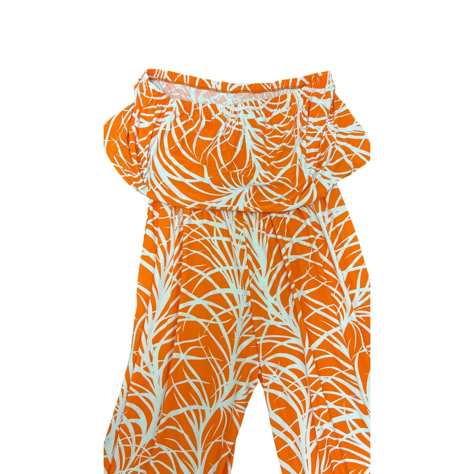 This Ashley Stewart jumpsuit is a showstopper! Featuring a bold orange and white print, strapless/off-shoulder neckline, and wide-leg pants. Stretch polyester-spandex blend for comfort, double size 26/28. Great condition with no major flaws. Ideal for vacation wear, resort looks, or statement party outfits.