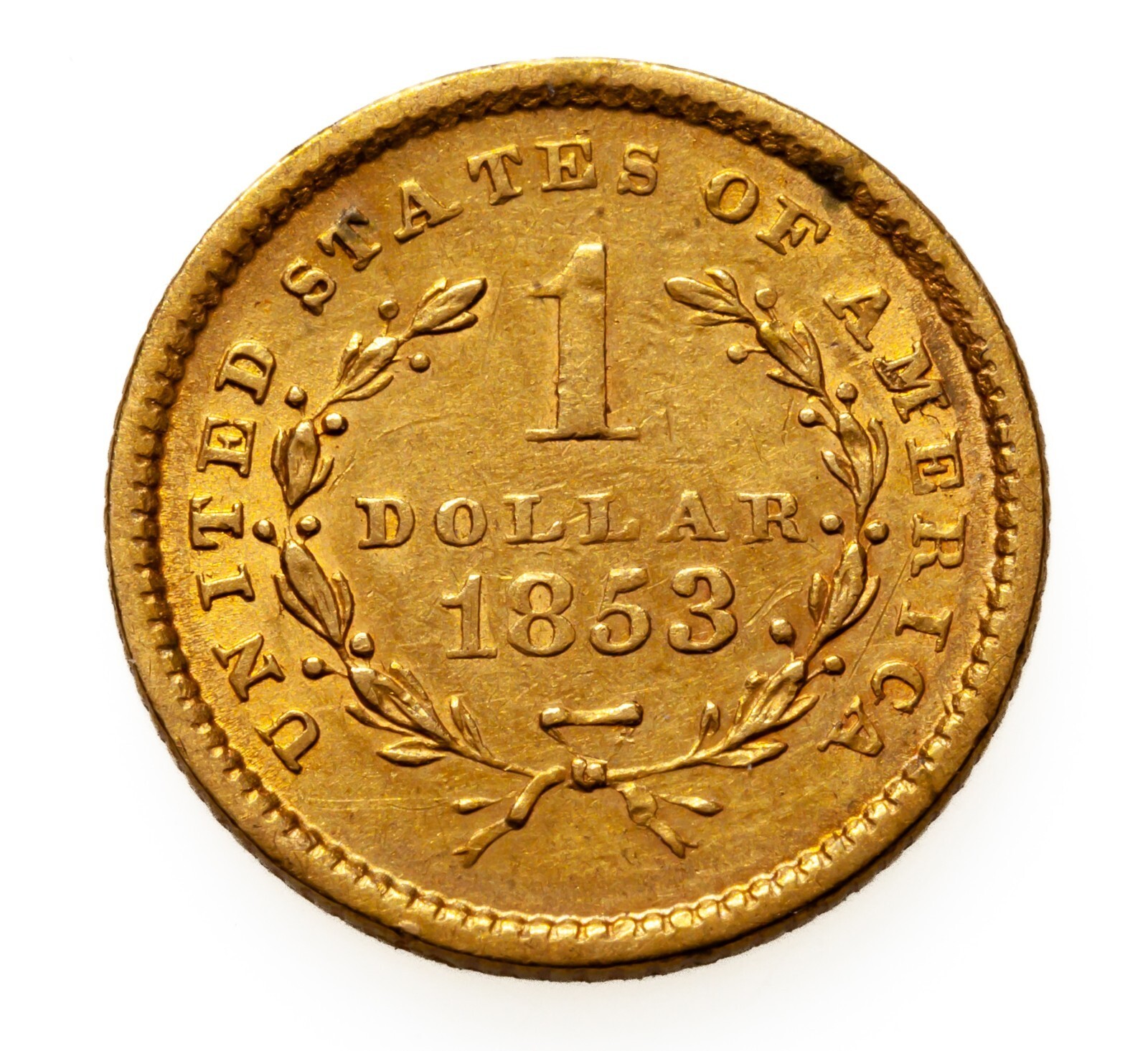 1853 G $ 1 Gold Liberty Un dolar en condiciones de AU no circuladas