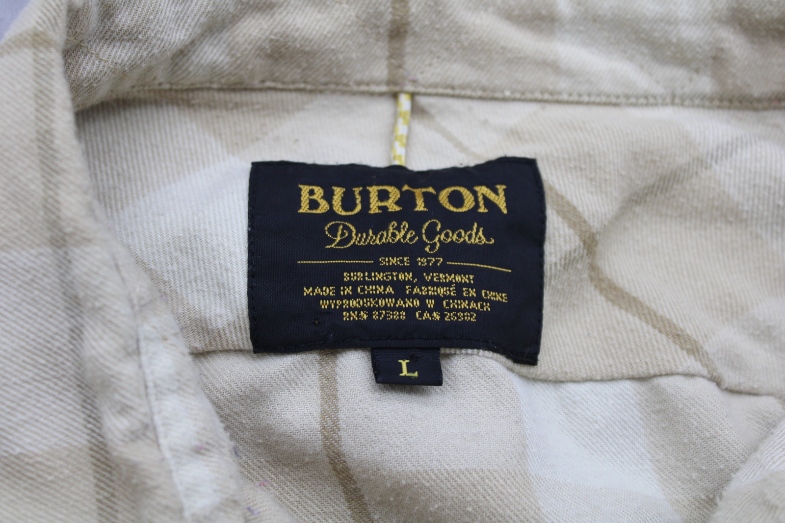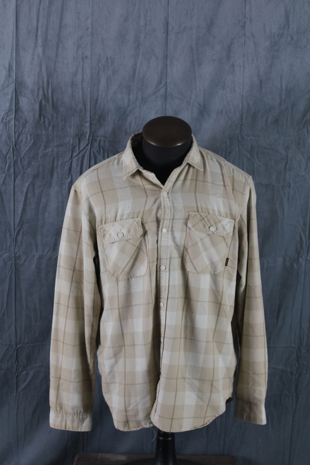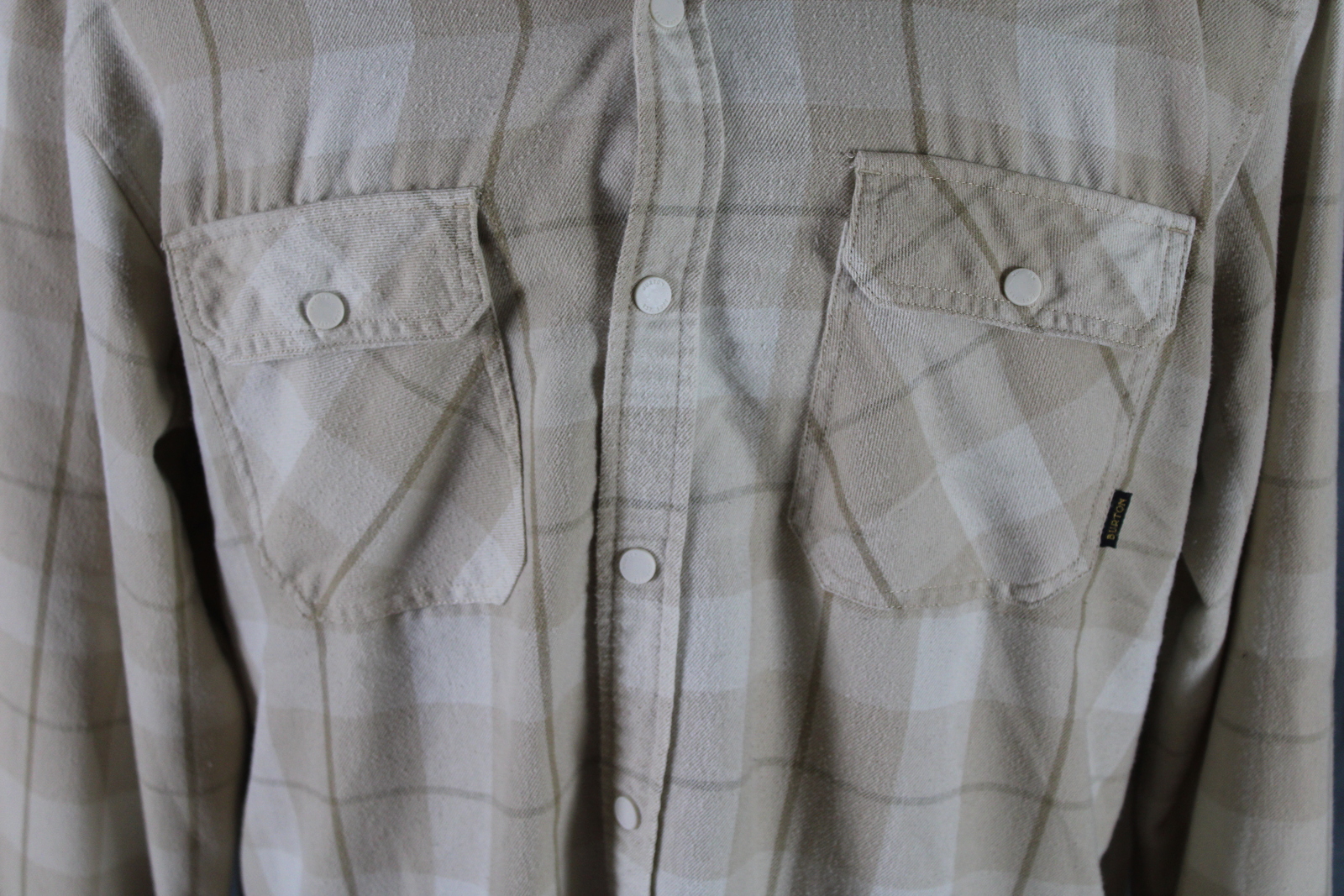 Up for sale is a Burton button-down shirt. It has a white and tan base plaid pattern. There are plastic snaps for the closures on the shirt. What a great shirt do not miss out on it.