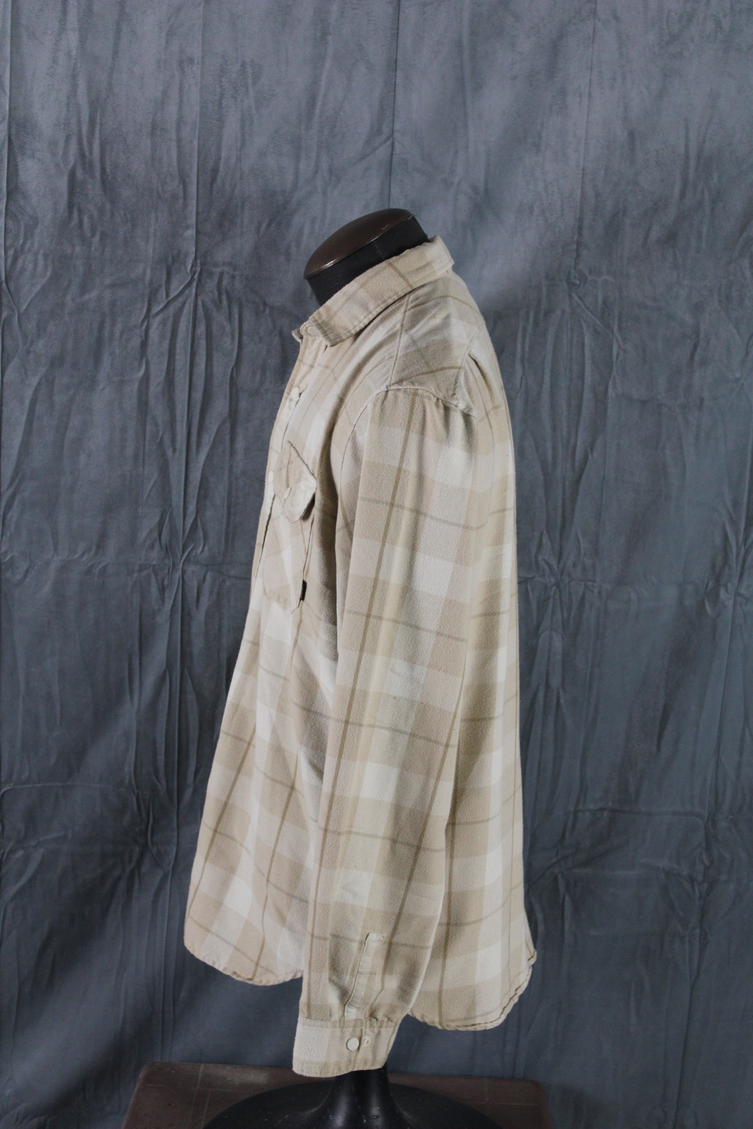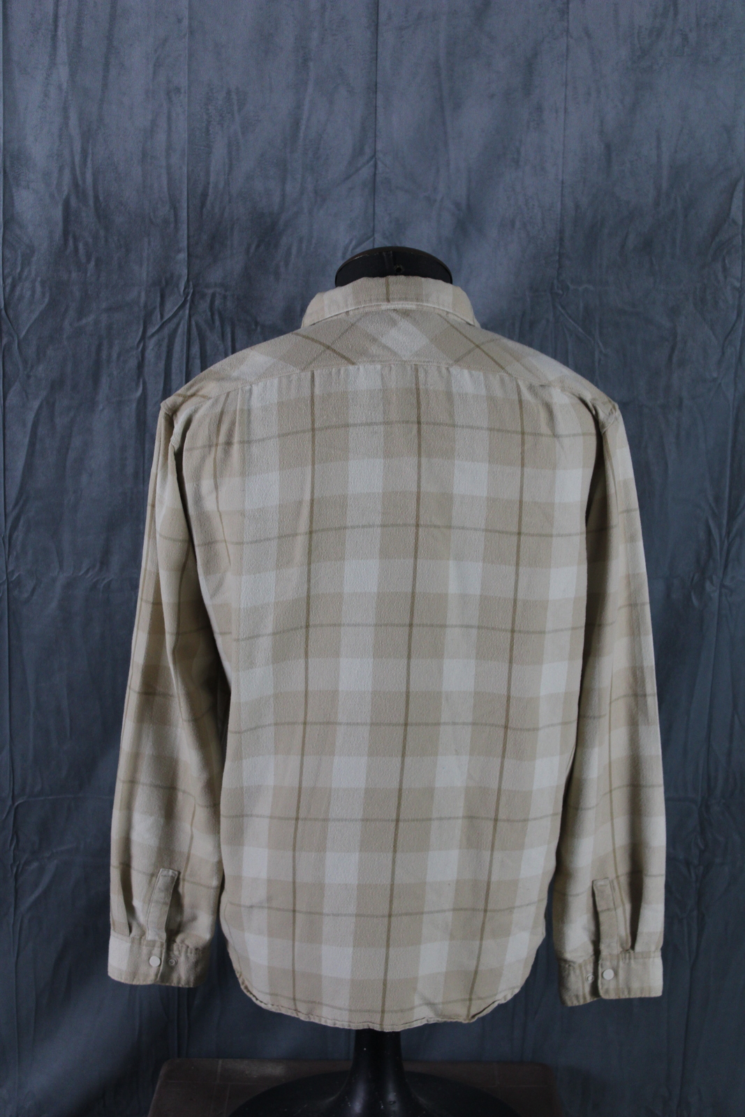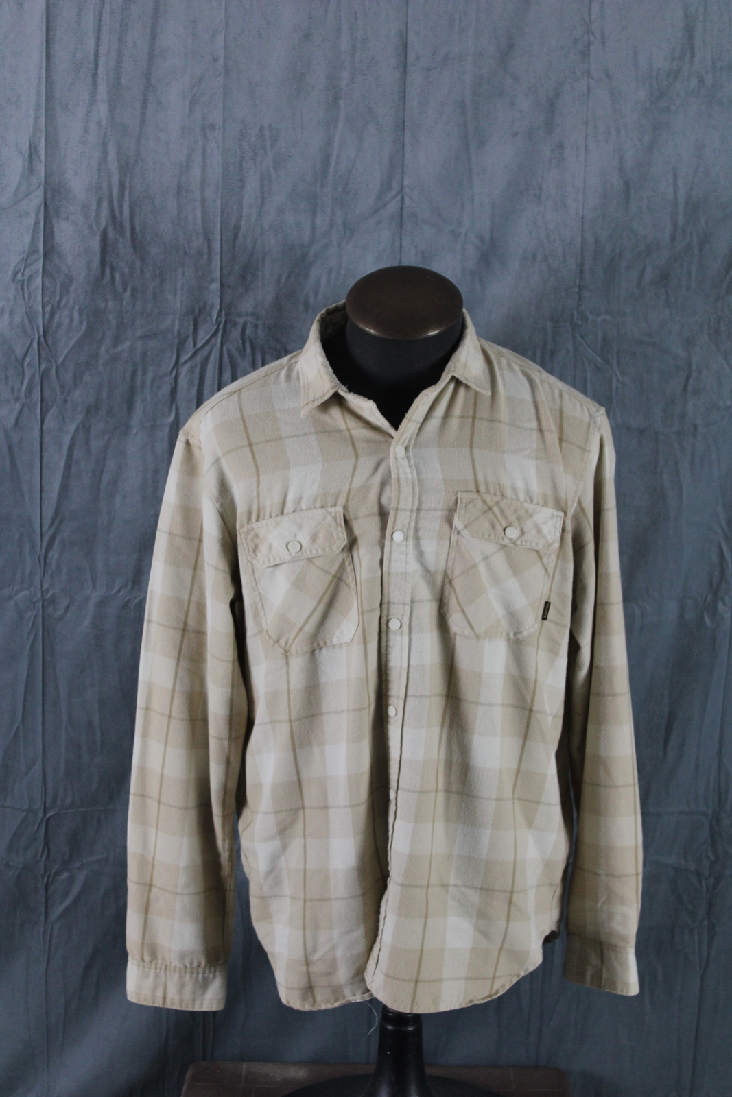 Up for sale is a Burton button-down shirt. It has a white and tan base plaid pattern. There are plastic snaps for the closures on the shirt. What a great shirt do not miss out on it.