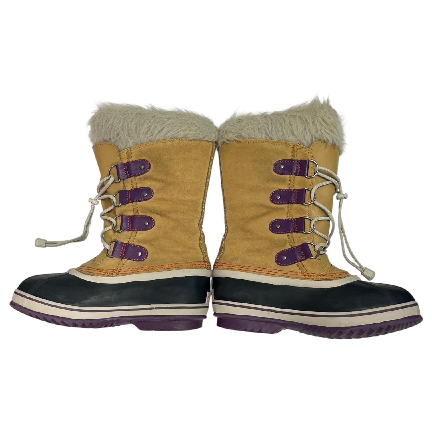 Features tan suede leather shaft, black waterproof rubber foot, white faux fur trim and lining for warmth, lace-up design with four purple hardware eyelets. Marked "SOREL" and "HAND CRAFTED NATURAL RUBBER" on heel. Wool felt liner and plush faux fur collar for added insulation and comfort. Durable purple treaded soles marked "WATERPROOF" for slip resistance in snow and ice.