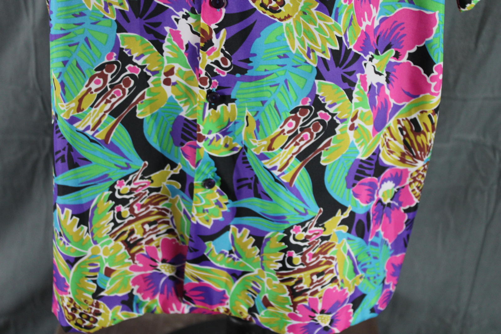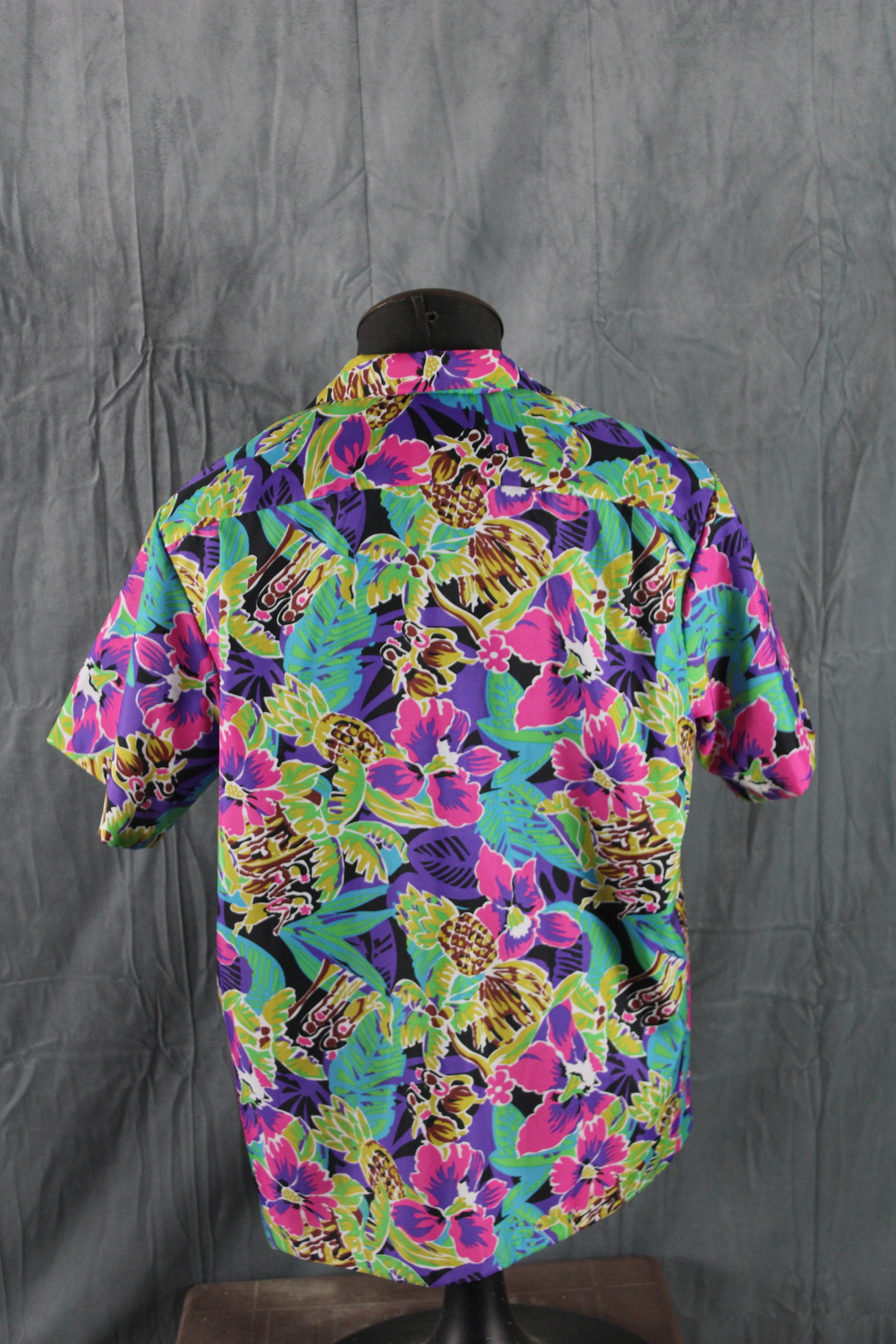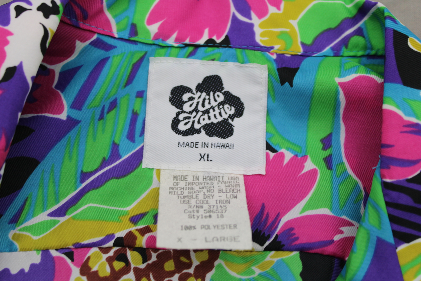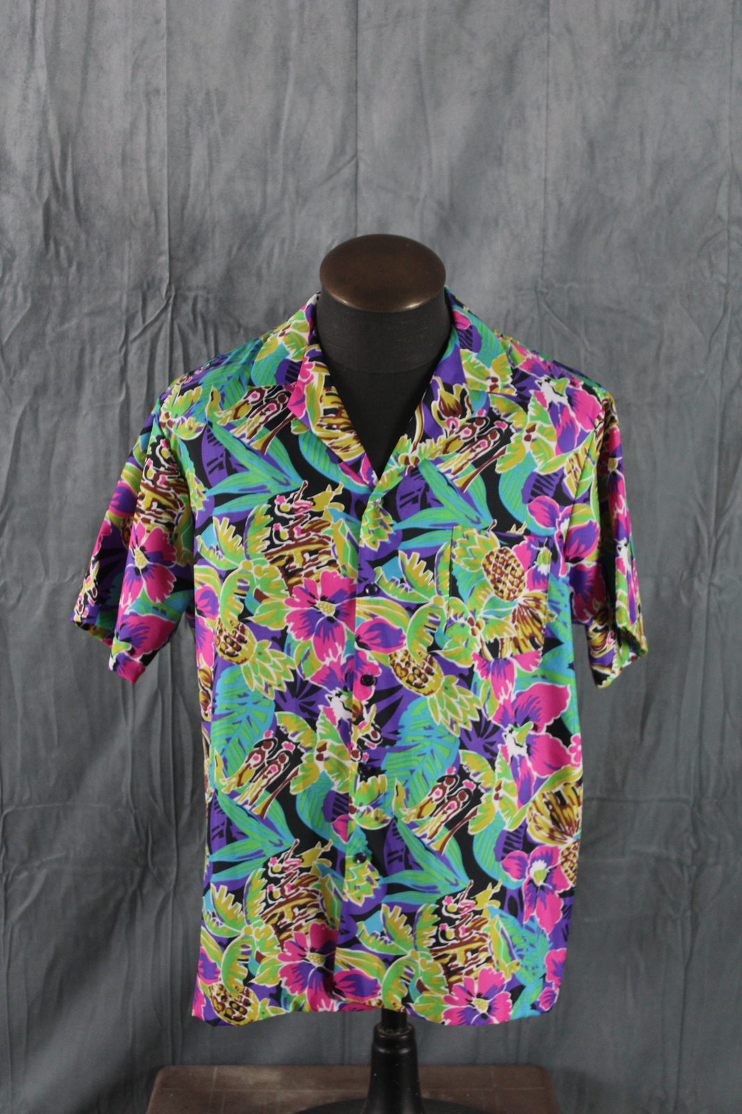 Up for sale is a vintage Hawaiian shirt by Hilo Hattie. It has an abstract floral pattern done in pink, yellow and green. The pattern is highlighted by random pineapples and hula girls. What a great vintage shirt do not miss out on it.