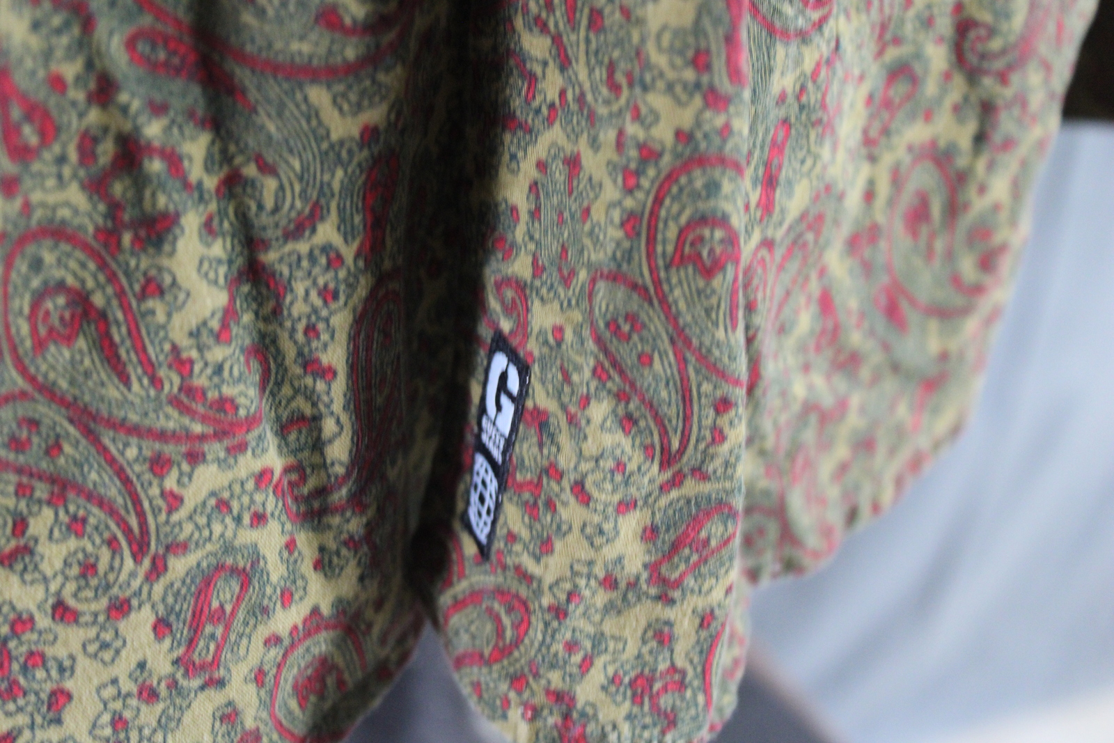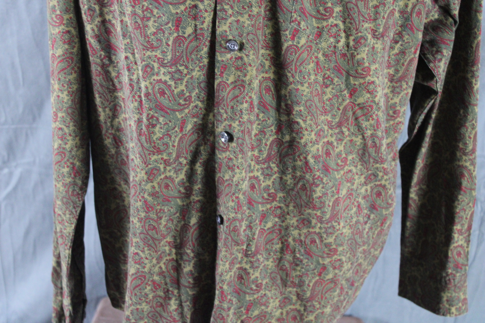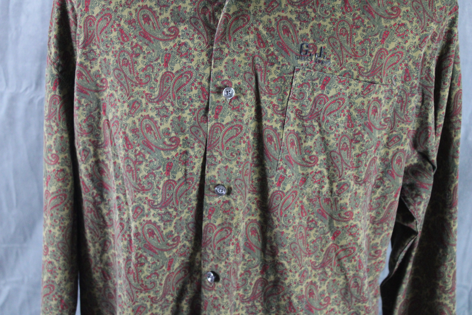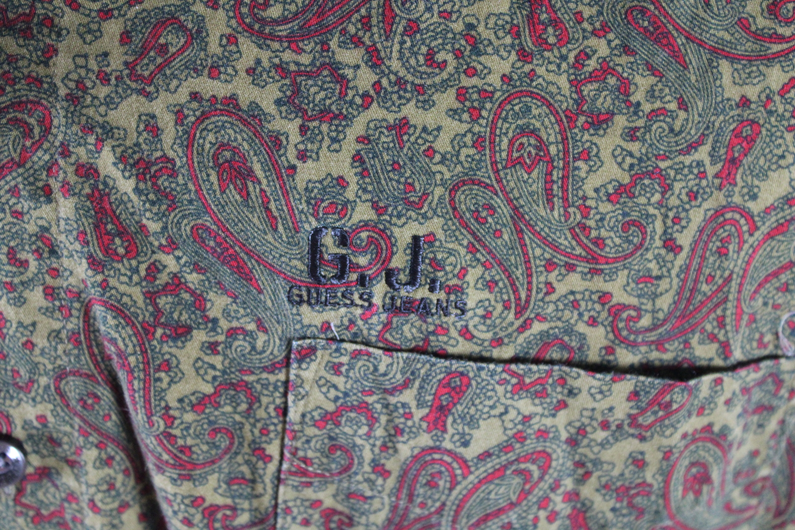 Up for sale is a vintage Guess long-sleeve shirt. It has a green, purple and brown paisley pattern. What an amazing shirt do not miss out on it.