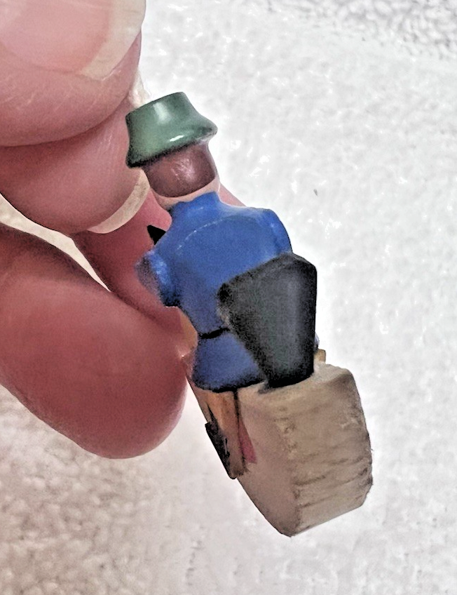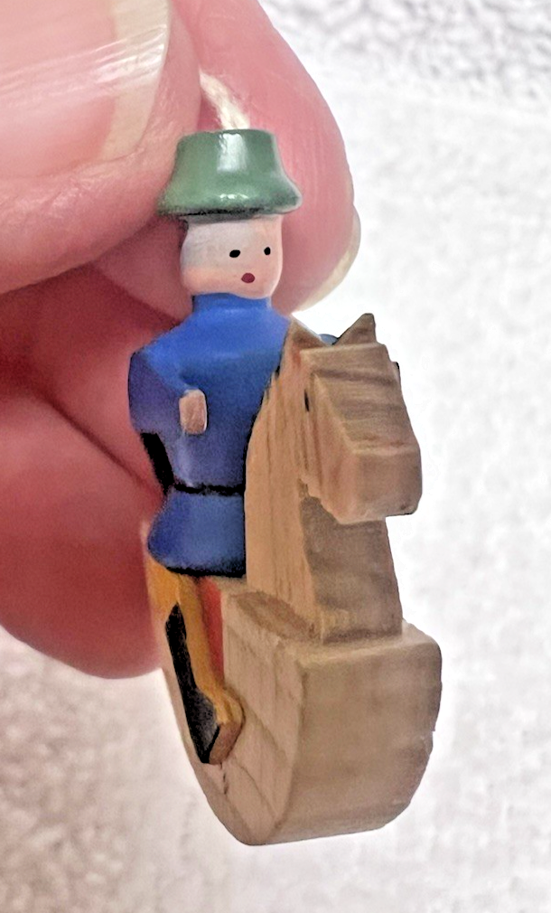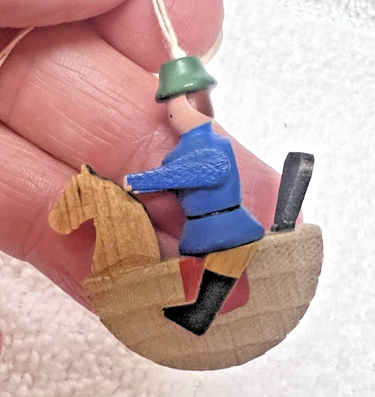 Erzgebirge Style Vintage Man on Rocking Horse Christmas Ornament In good shape has original long hanger string 1 1/4 x 1 3/8"