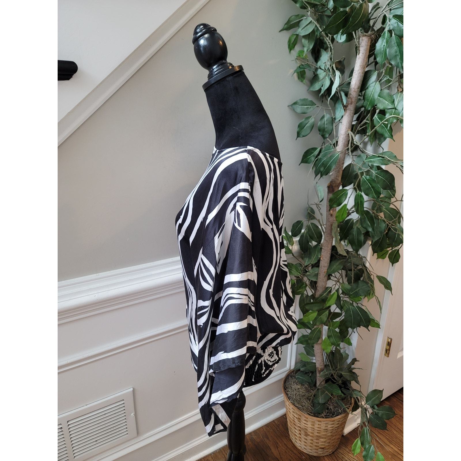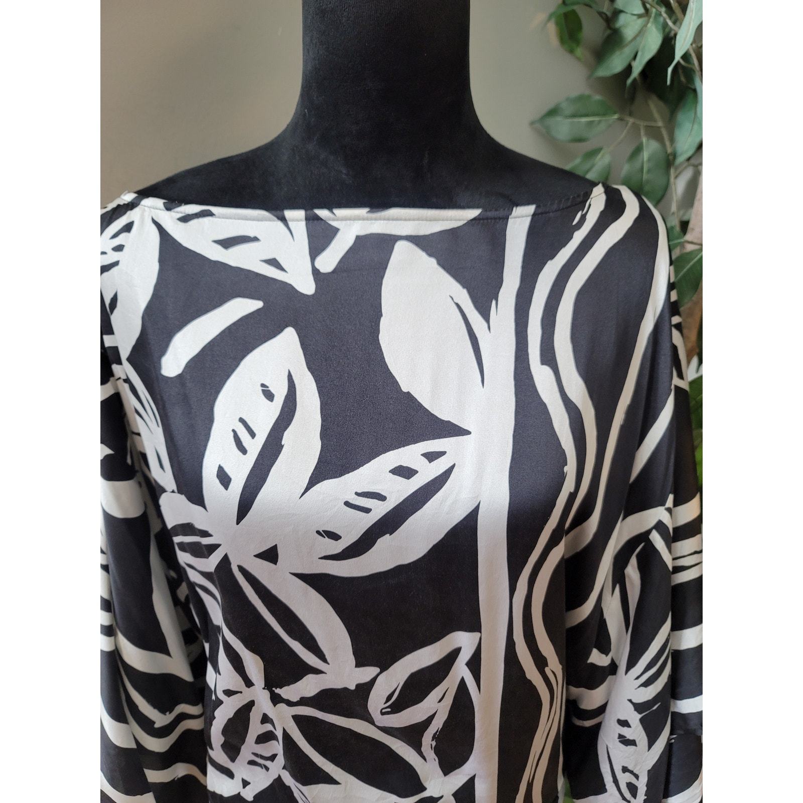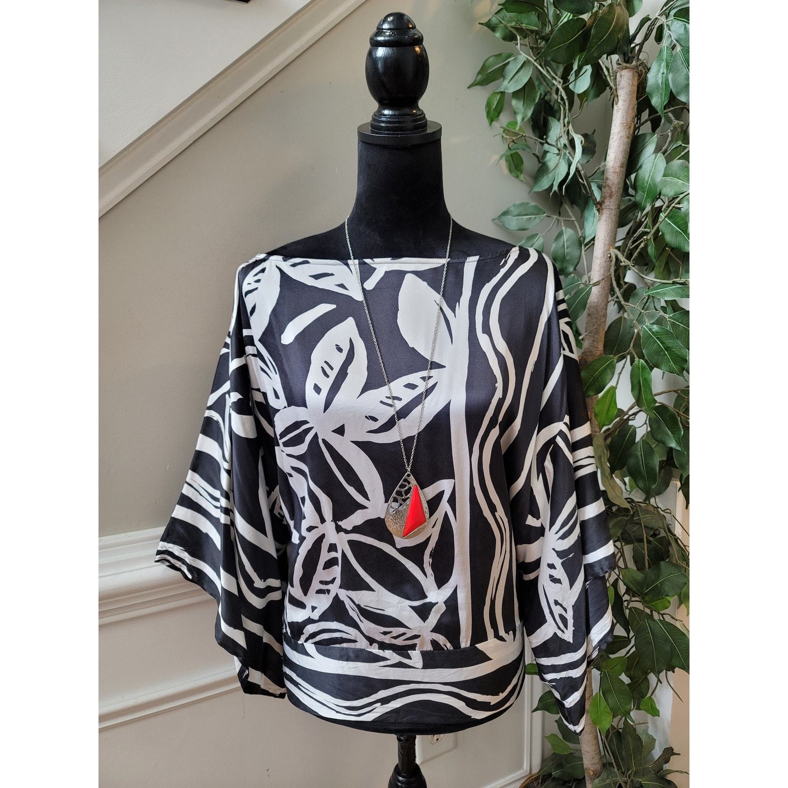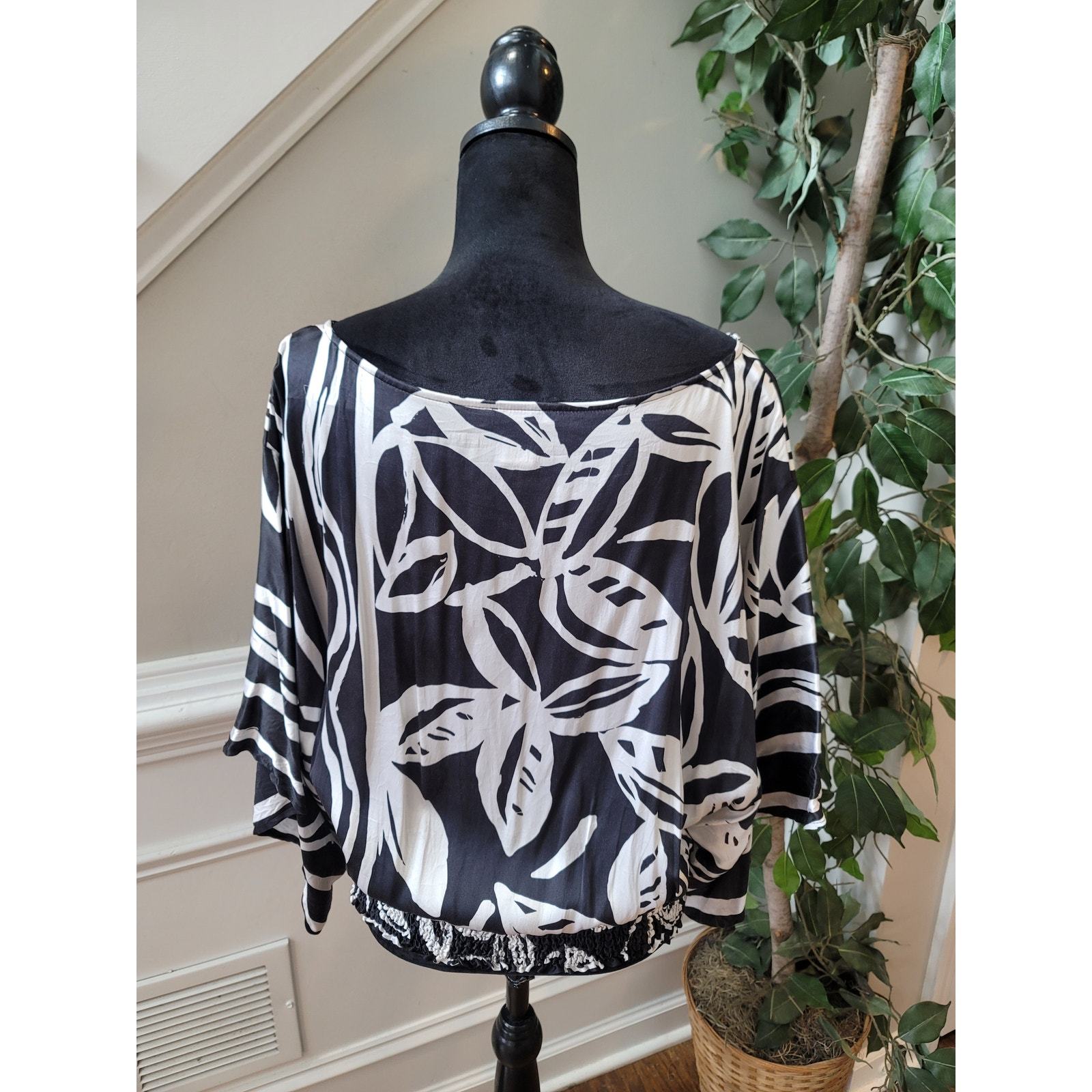 Cache Silk Blouse Womens Large Black White Floral Print Batwing Sleeve Top