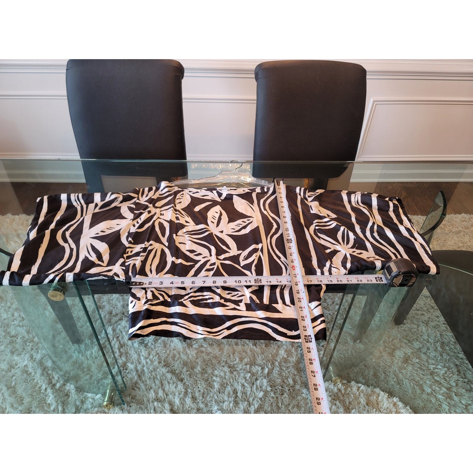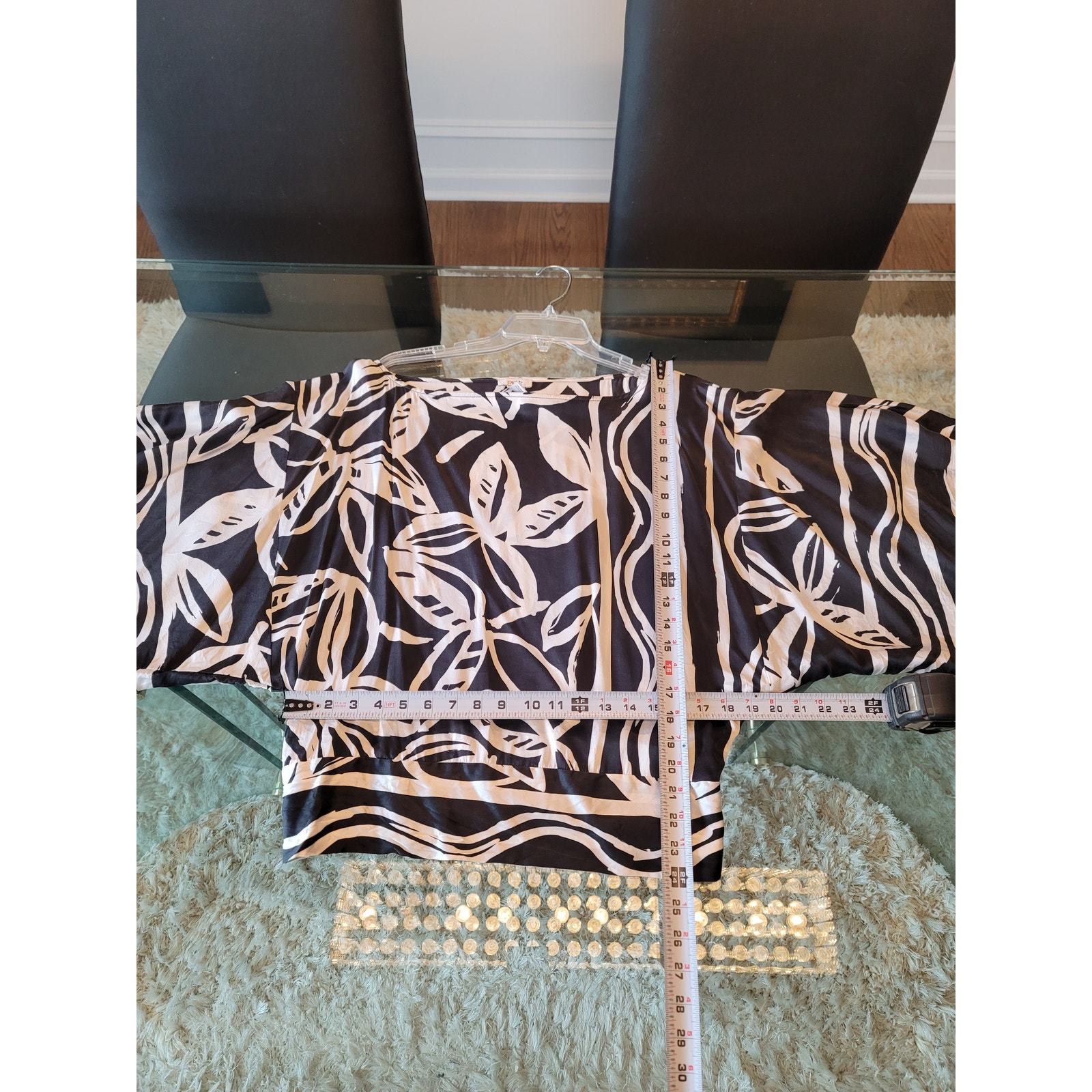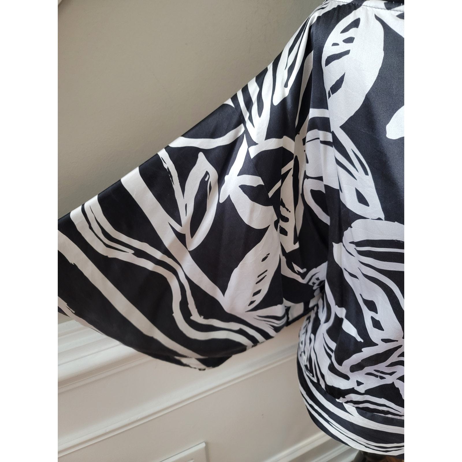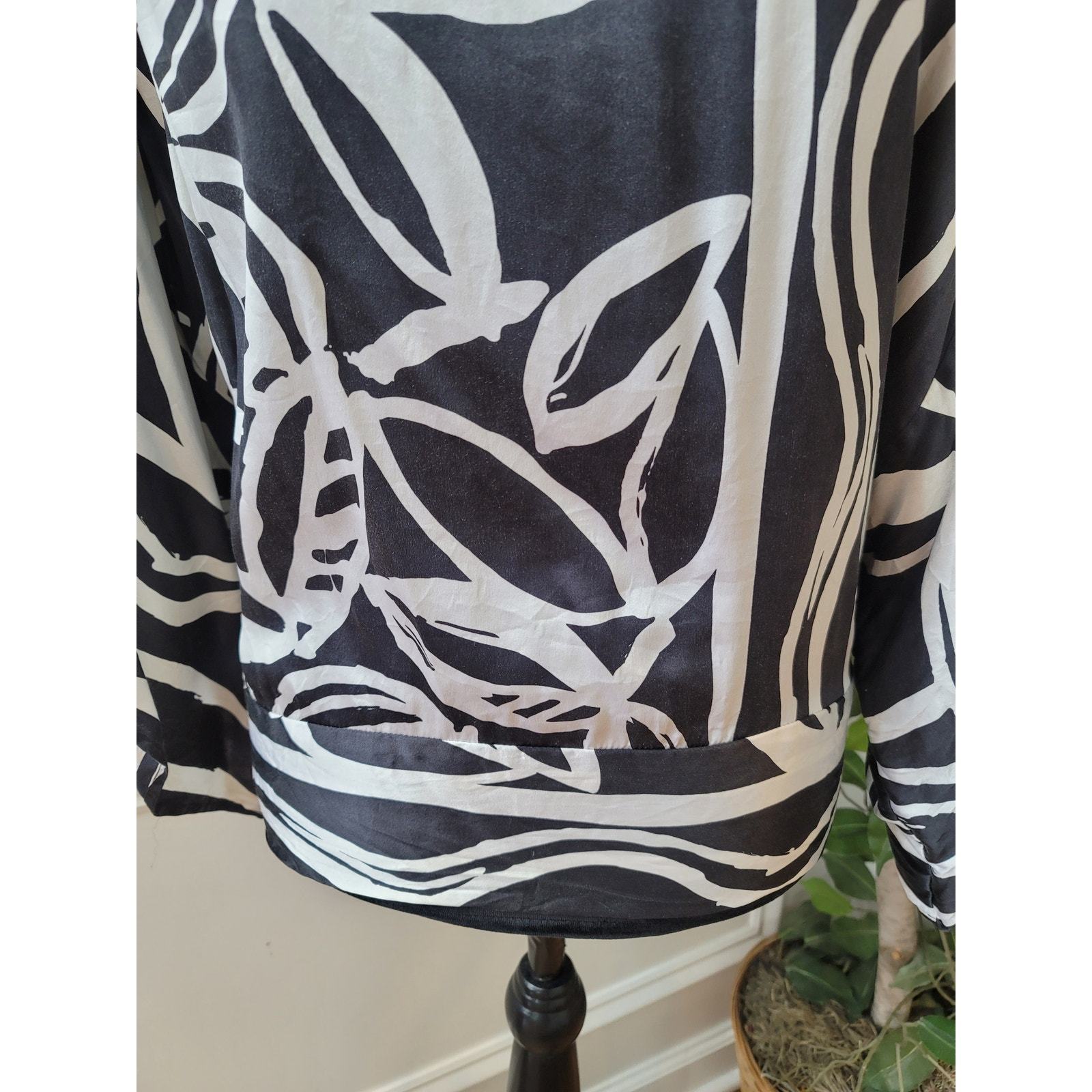 This Cache silk blouse is a stunning addition to any wardrobe. The black and white floral print is eye-catching, and the batwing sleeves add a touch of elegance. The blouse is made of high-quality silk, which drapes beautifully and feels luxurious against the skin. It is a size large and in excellent condition.