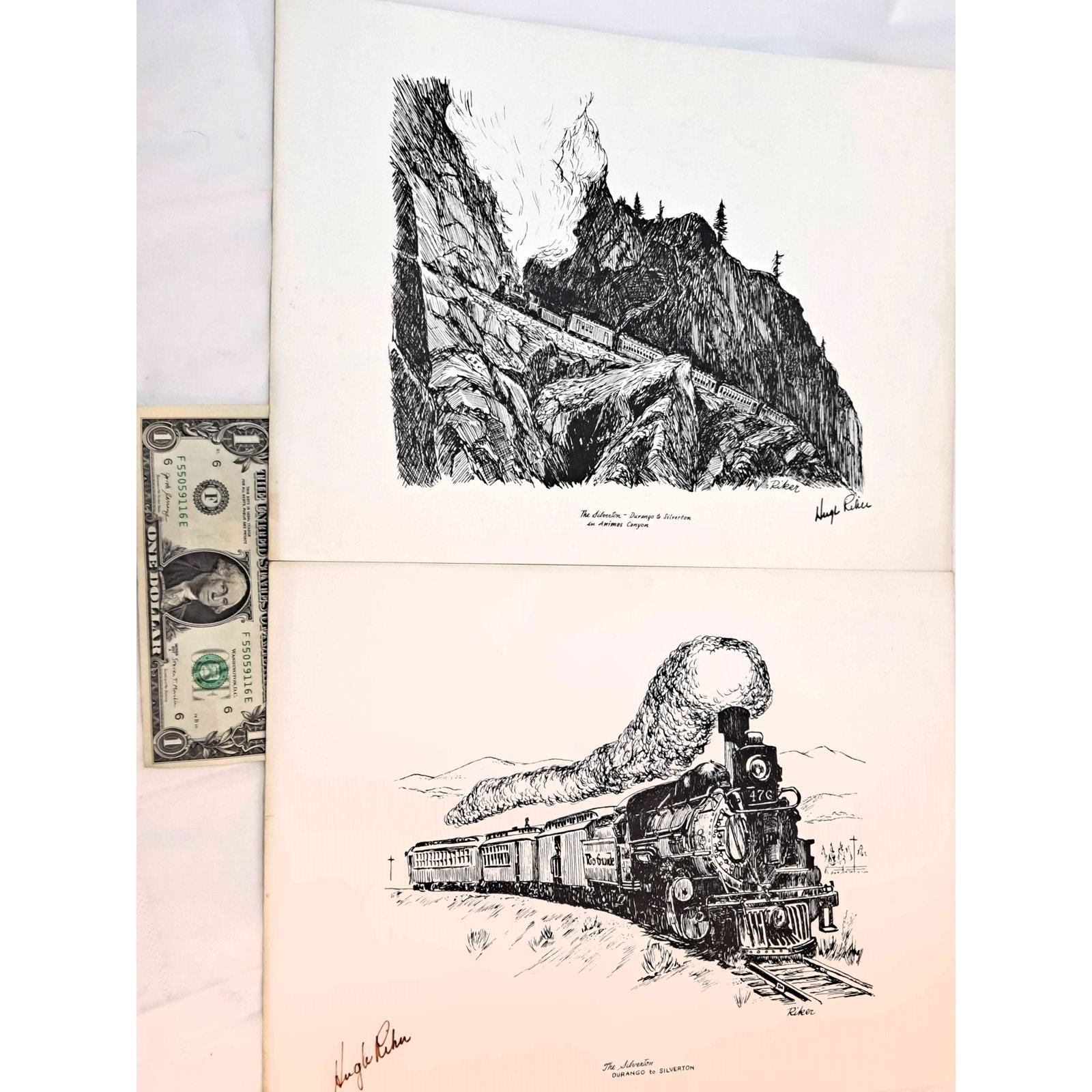 The Durango to Silverton narrow gauge railroad still exists as a tourist attraction. Laid-in are two 14" x 10" ink drawing prints, both drawn hand-signed by Hugh Riker (1921-2012), of that tourist train ride.