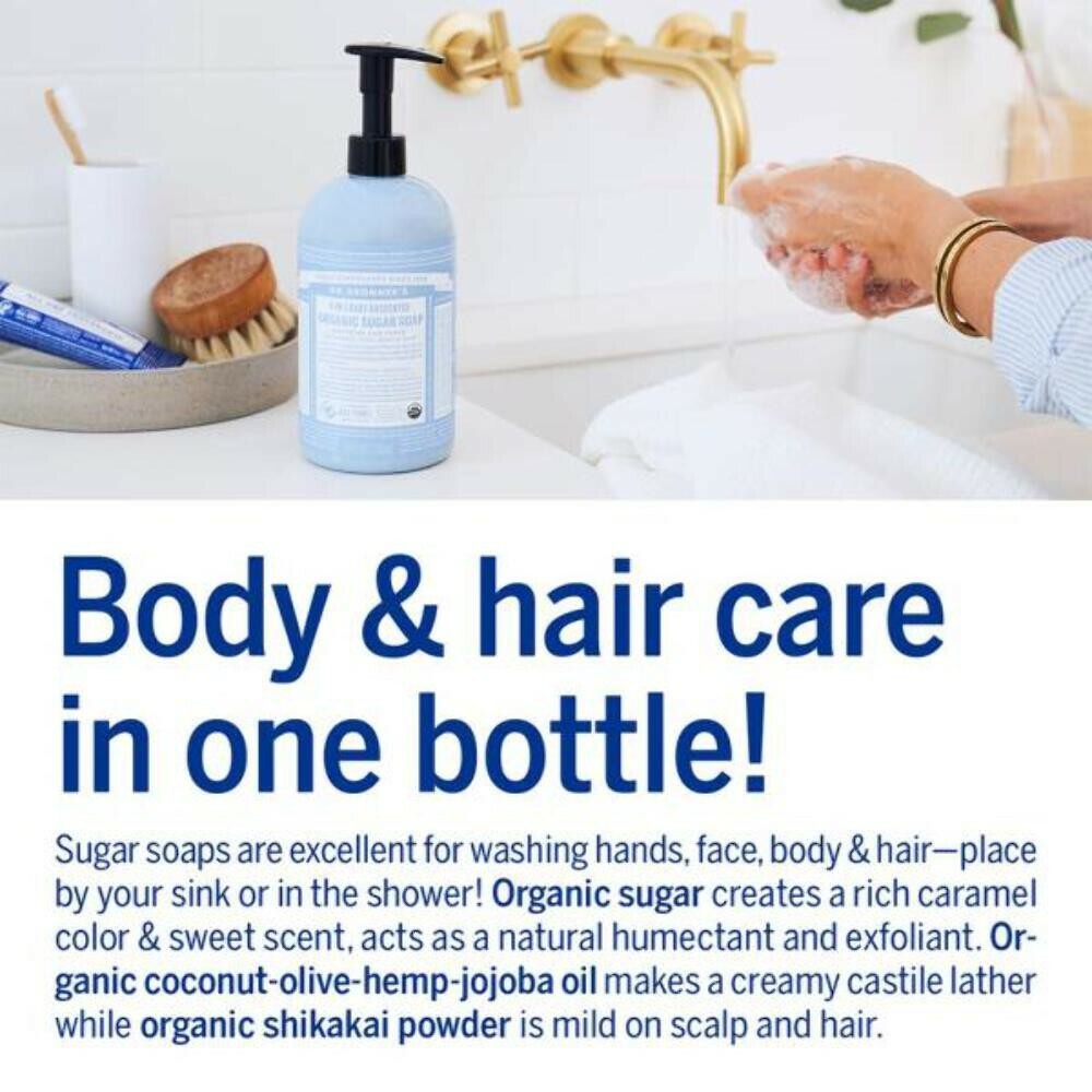 ? USDA ORGANIC FAIR TRADE INGREDIENTS: Fair trade organic sugar and shikakai powder nourish and hydrate skin. Organic coconut, olive, and hemp oils create a creamy castile lather?Dr. Bronner?s soap making tradition ? HEAVENLY SCENTS VERSATILE USE: Pure essential oils and organic sugar offer a gentle aroma. This liquid soap is ideal for hands, face, body, and hair?an elegant and effective addition to any bath or kitchen ? ORGANIC SHIKAKAI POWDER: Derived from the shikakai tree, this traditional Indian ingredient gently cleanses and conditions skin and hair. Our organic sugar soap is mild, low pH, and perfect for sensitive skin ? ORGANIC FAIR TRADE PALM KERNEL OIL: Sustainably grown by fairly paid farmers, this oil creates the rich lather in Dr. Bronner?s sugar soap while supporting communities and protecting local ecosystems ? ECO-FRIENDLY LIQUID SOAP PACKAGING: Dr. Bronner?s liquid soap comes in 100% post-consumer recycled plastic bottles?diverting waste from landfills and helping reduce environmental impact with every wash