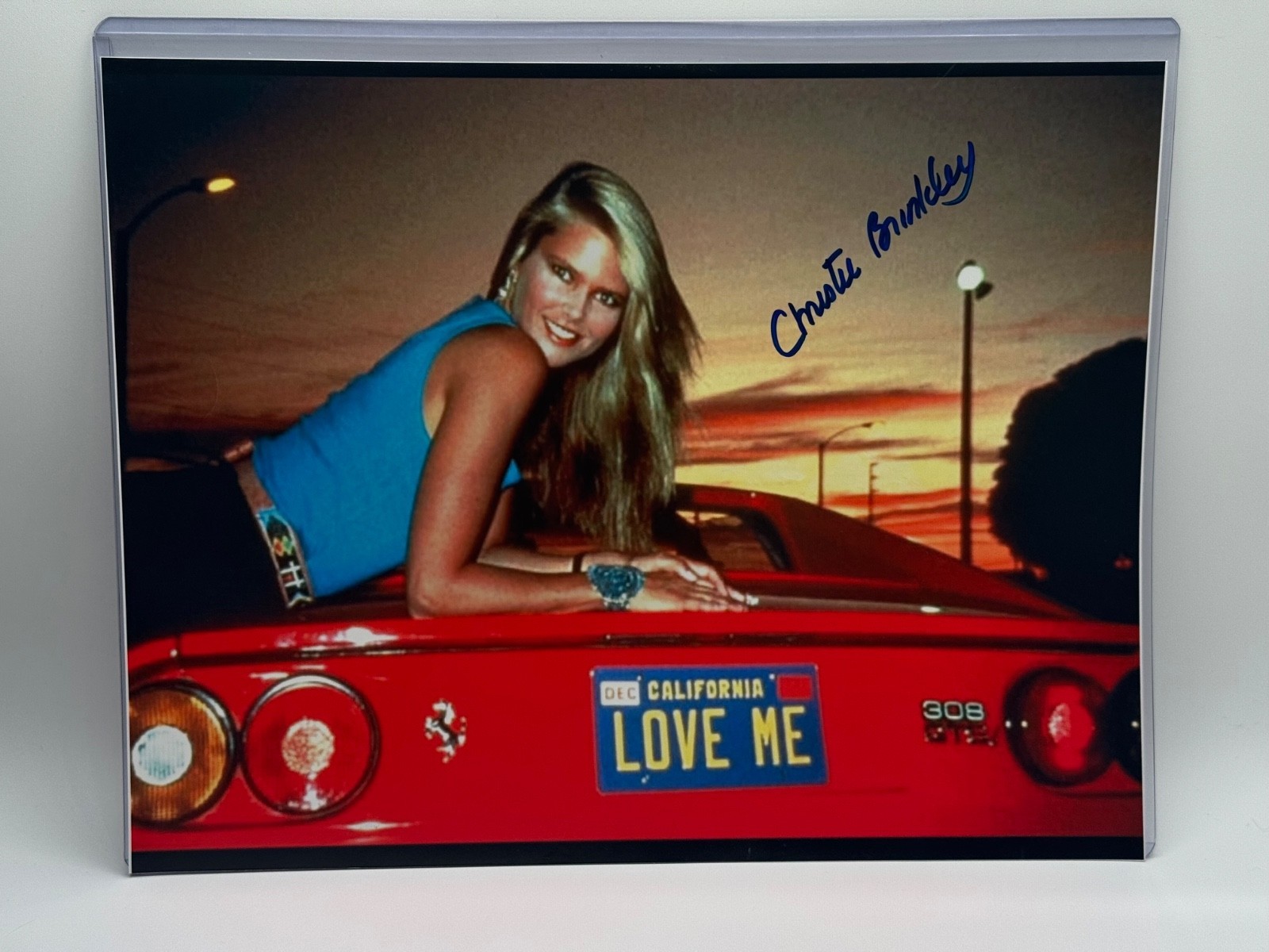 The product is an 11x14 signed photo of Christie Brinkley from the movie "National Lampoon Vacation" with the inscription "Love Me Ferrari." This original piece of entertainment memorabilia captures a memorable moment from the film and is a unique collectible for fans of Brinkley or movie enthusiasts. The signature adds a personal touch to the photograph, making it a special item for any collection or display.