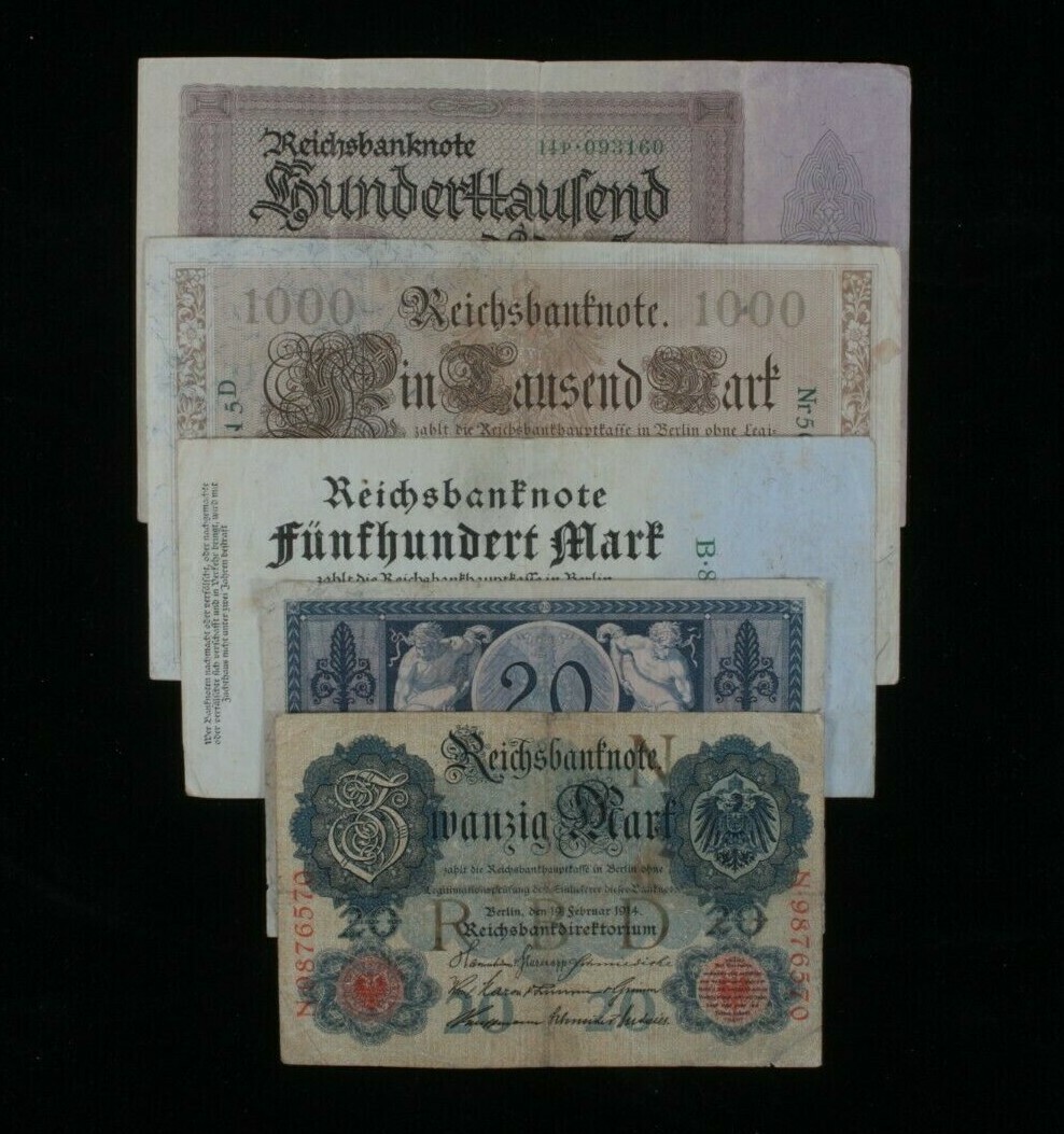 1910-1923 Germany 5-Notes Set // 20 Mark to 100,000 Mark // Empire Weimar