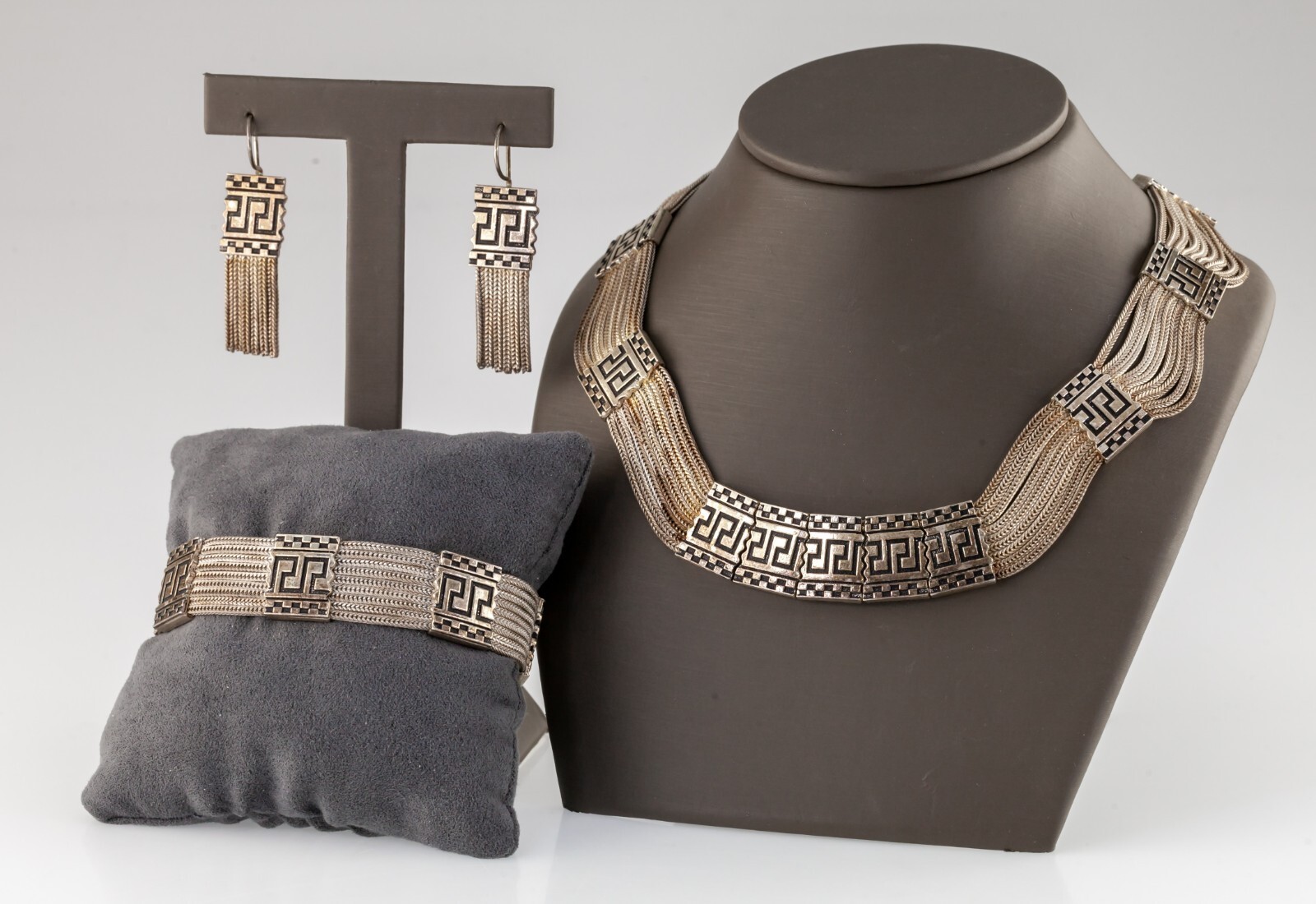 Sterling Silberschmuck Set Multi-Chain-Griechenmotiv Armband Ohrringe Halskette