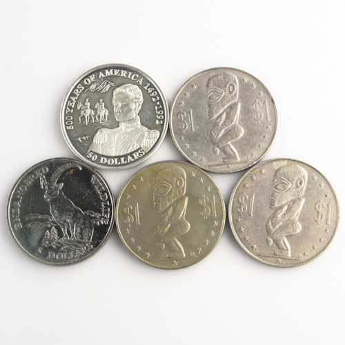 Publie sous le regne d'Elizabeth II, reine du Royaume-Uni (1952-) Comprend les annees / denominations / conditions suivantes: 1972-1983 Dollar des Îles Cook - "Tangaroa" (Dong Dollar) - Cuivre-Nickel - KM # 7 1973 1 Dollar - Tirage: 49,000 - Very Fine or Better (VF) [3 pieces] 1991 Îles Cook 5 dollars - "Ibex" (faune en voie de disparition) - Cuivre-Nickel - KM # 223 1991 5 Dollar - Tirage: 100,000 - Uncirculated (UNC), avec des taches brunes 1993 50 Dollar - Tirage: 60,000 - BE (PF) Frappe de 0,925 argent ou cuivre-nickel Numero de catalogue: KM # 7, KM # 223, KM # 248 Visitez notre boutique: Continental Coin and Jewelry Acheteurs californiens: Departement Web de Continental Coin and Jewelry Company: Lundi - vendredi, de 10h30 a 18h00 PST Numero d'article de reference FCC-2312 JB