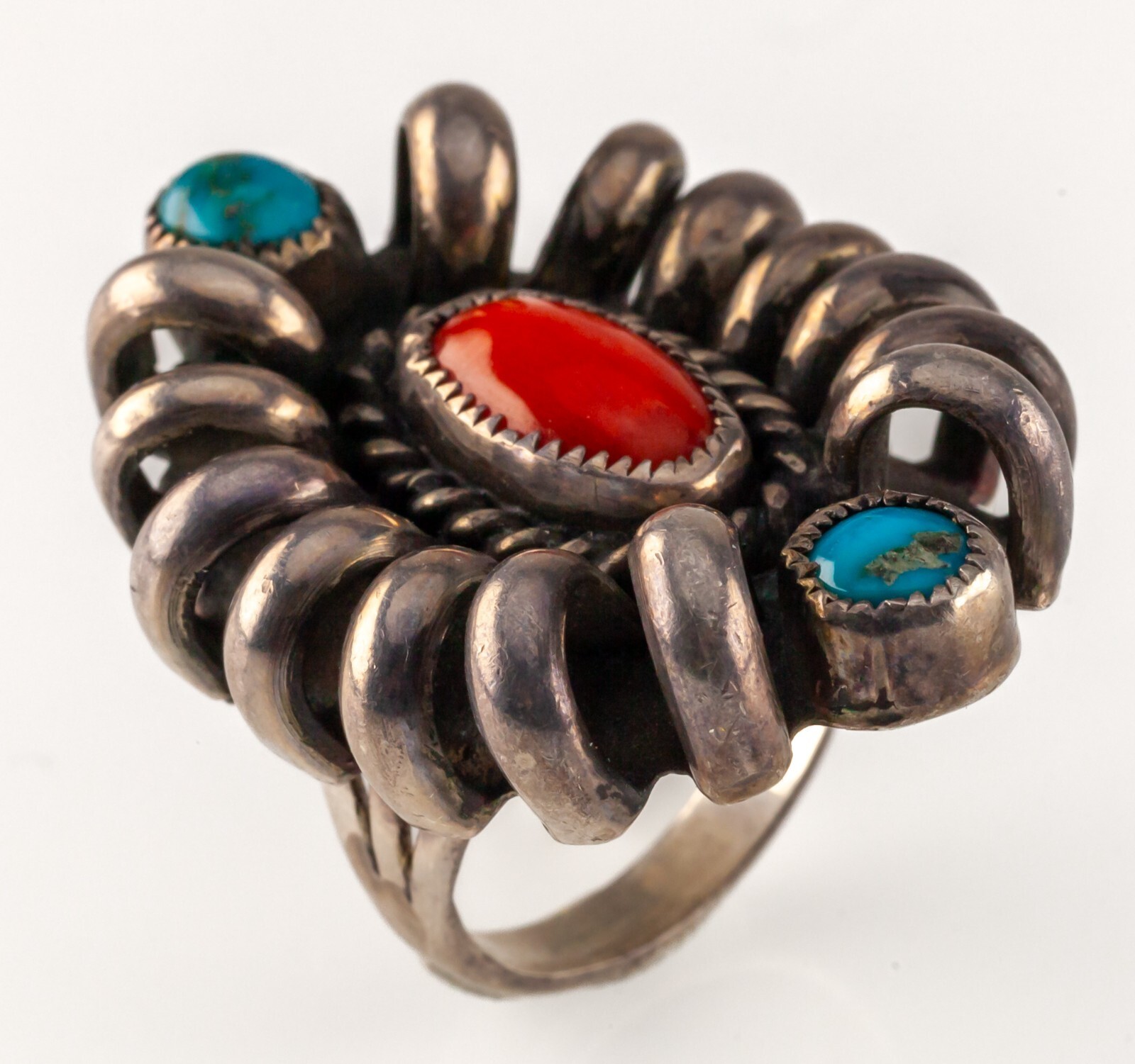 Vintage Firmato RB Navajo Sterling Sterling Silver Turquoise Coral Ring SZ: 6.50