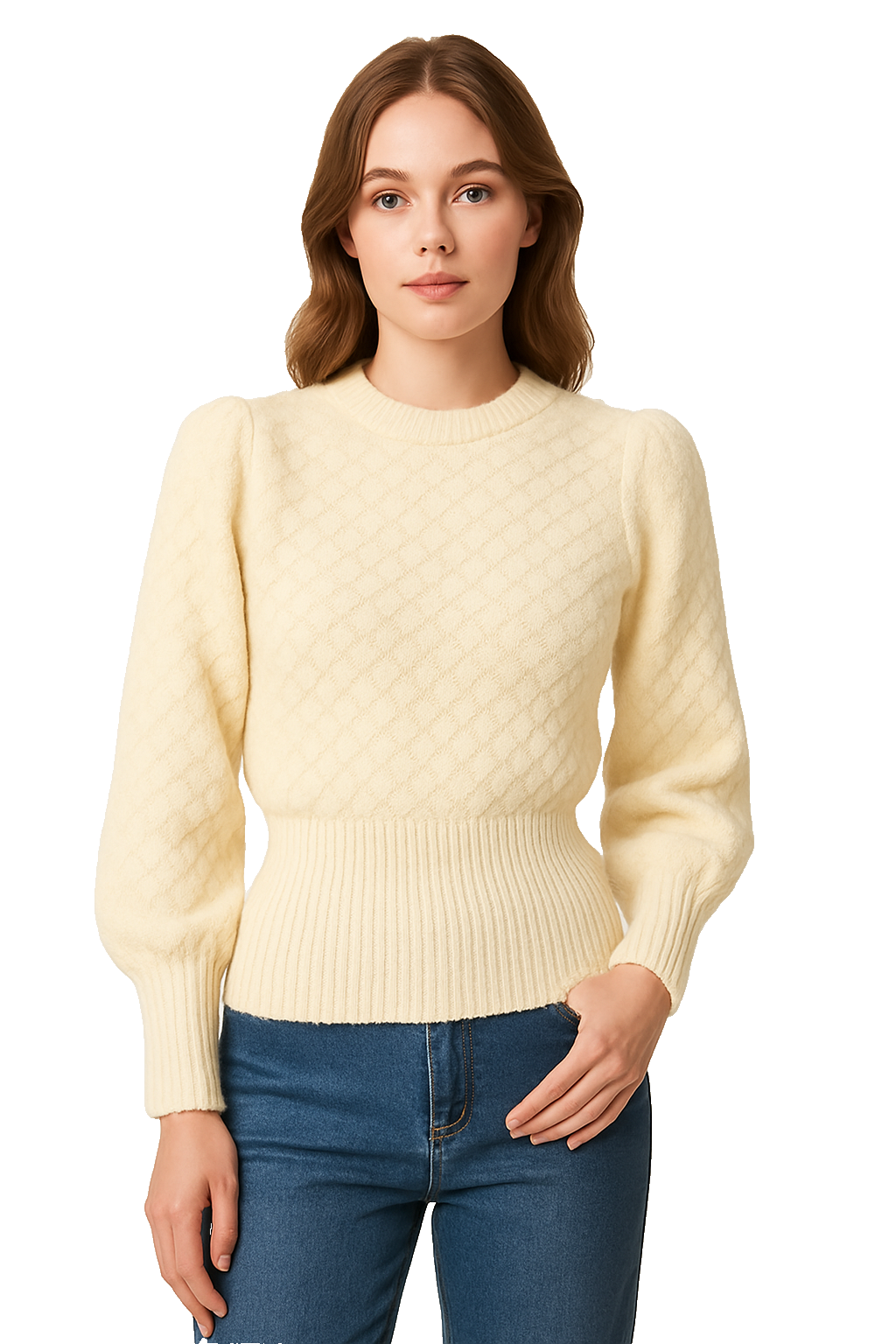 Vintage 1970s Andrew St. John ?Uniquely Knit? ivory sweater with a 1930s?40s inspired silhouette. Features a wide 3? ribbed waistband, puffed shoulders, and long rib-knit cuffs. A perfect example of late 1970s knitwear drawing on earlier decades for styling inspiration.