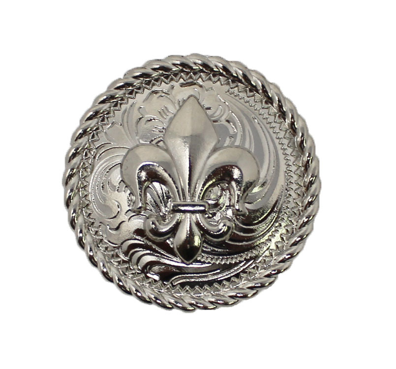 Set of 4 screw back rope edged Fleur De Lis conchos. Measures 1 1/4" (32 mm) in diameter. Easy to install with chicago screws included. Beautifully accents any tack, saddle, belt, etc.
