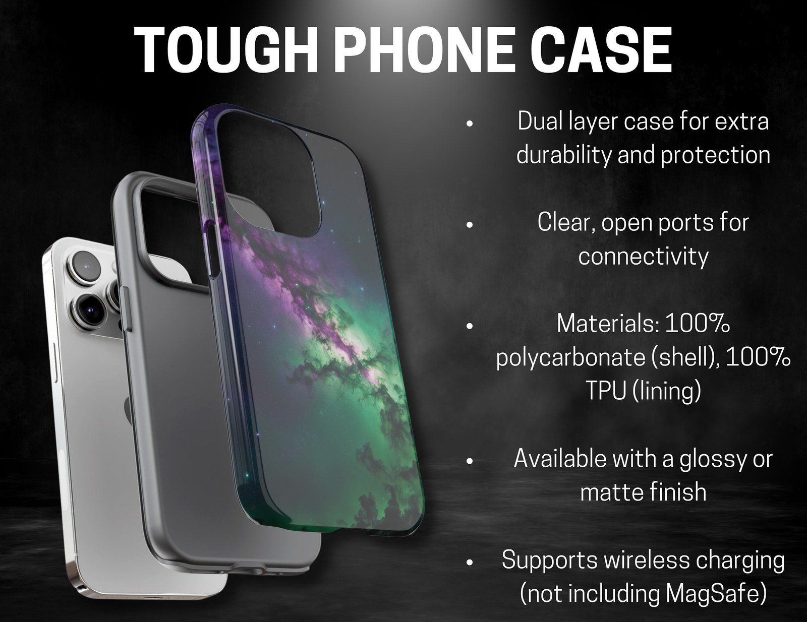 Step into the enchanting realm of outer space with our mesmerizing phone case design featuring a breathtaking backdrop of nebulae, galaxies, and stars. With the option to personalize, you can make this celestial masterpiece uniquely yours, adding a touch of cosmic flair to your everyday essentials. Elevate your style and spark conversation wherever you go.