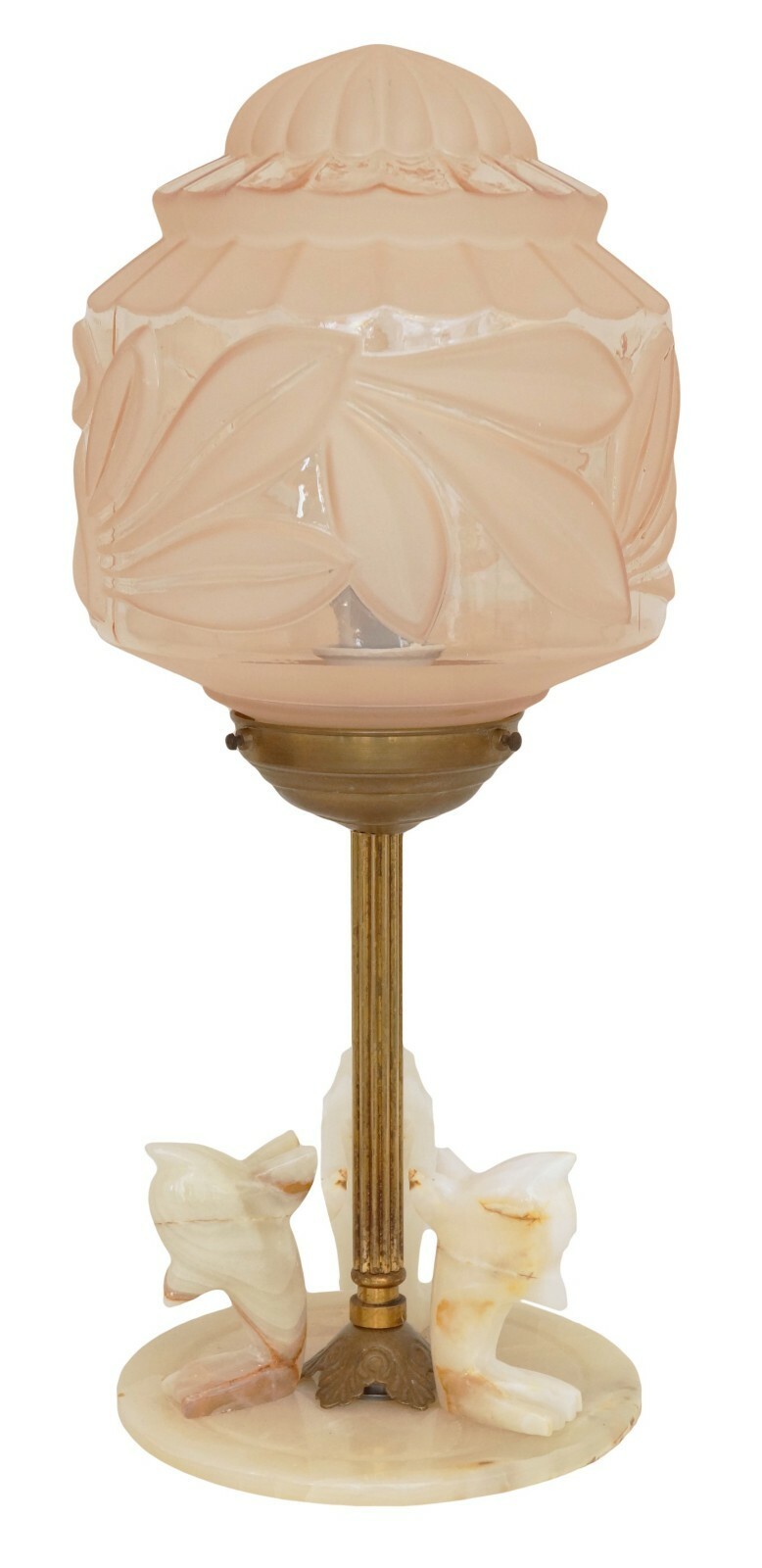 Unique design table lamp from our lighting manufacturer. Brass onyx gear with carved dolphin plastic. Magnificent, antique lamp glass with etched flower motifs, approx. 1920s. Total height approx. 50 cm, umbrella diameter approx. 20 cm. Completely new electrical installation. Brass-colored PVC supply line with cord switch. Antique E27 brass version with porcelain clocks, up to max. 60 watts - we urgently recommend LED lamps. Hundreds of more kind of deco lights in our shop! Small parts such as screws and washers renewed. Please note: All of our lights have been circulated well before 2005, are in their original condition and therefore do not fall under the electrical and electronic device law (WEEE guideline of the EU). Sale without decoration and lamp! Shipping within Germany free of charge!