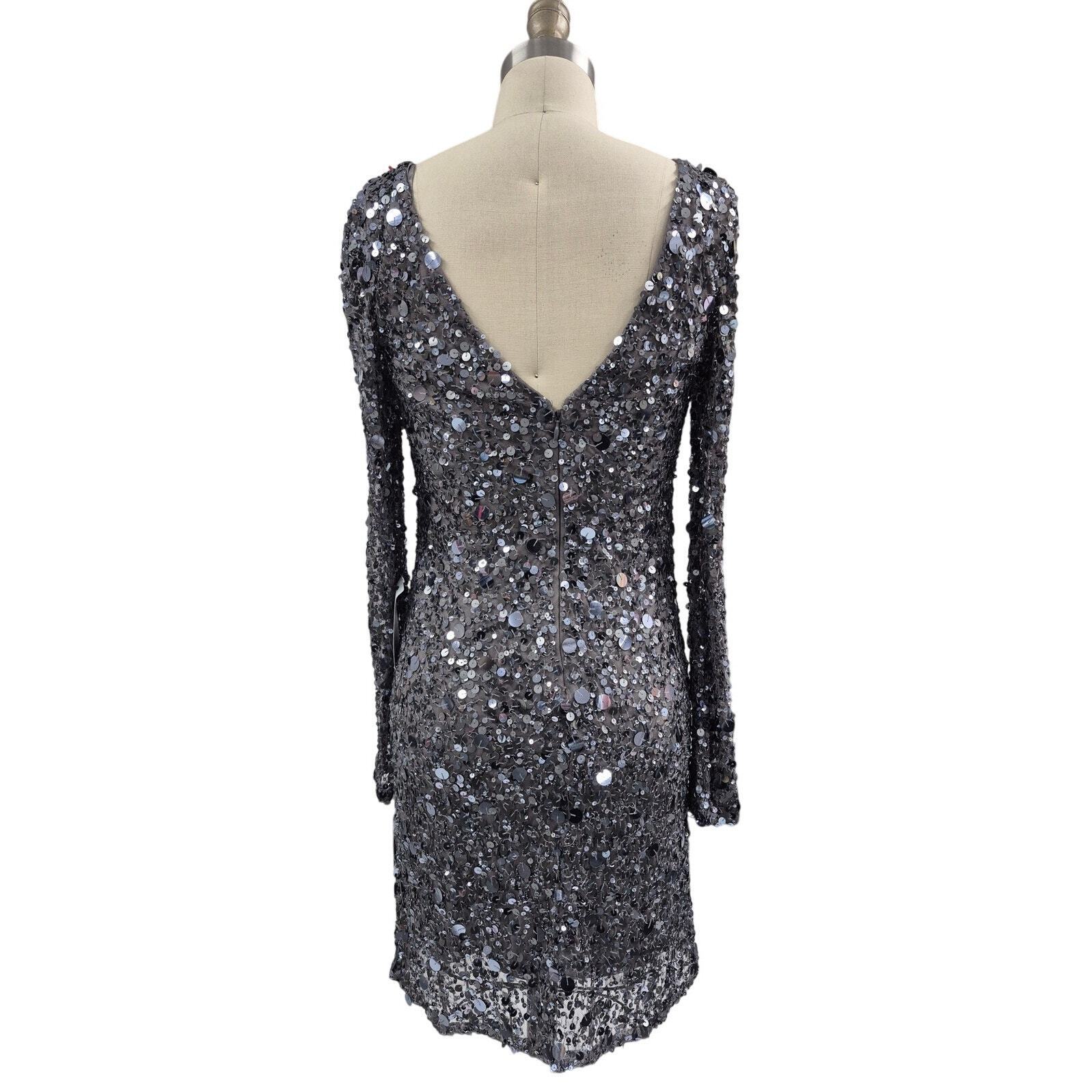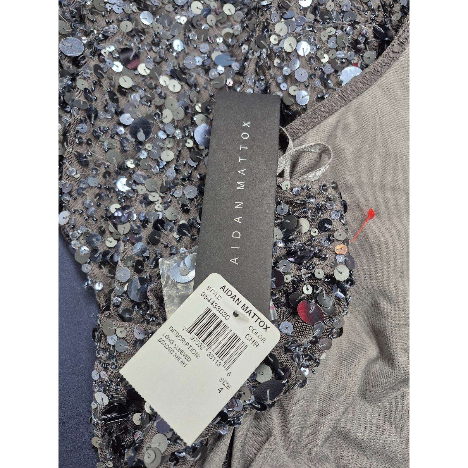 NWT Aidan Mattox Silver Fully Sequined Party Dress Long Sleeve Mini Dress Sz 4