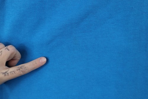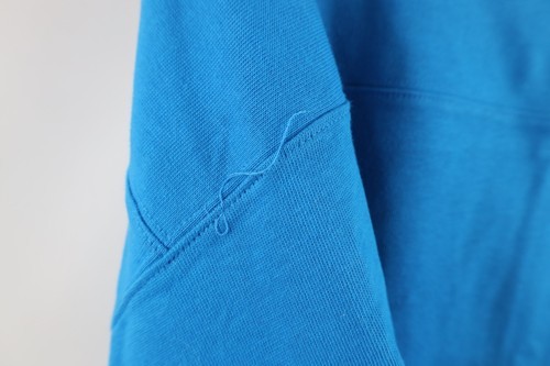 Blemishes front/collar. Loose threads right arm. Collar, cuffs/arms discolored. Sun fade front, back. Color faded. Pilling