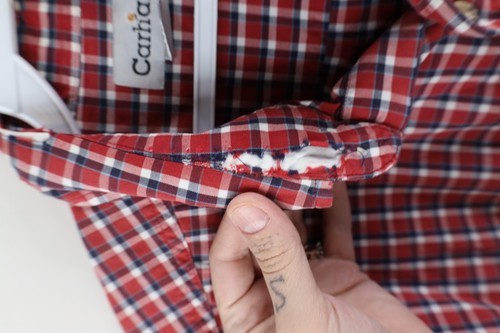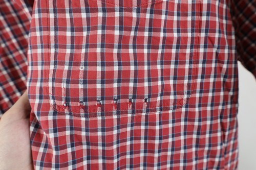 Holes collar, pocket, arms. Logo patch distressed. Collar discolored. Color faded