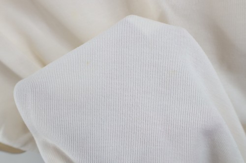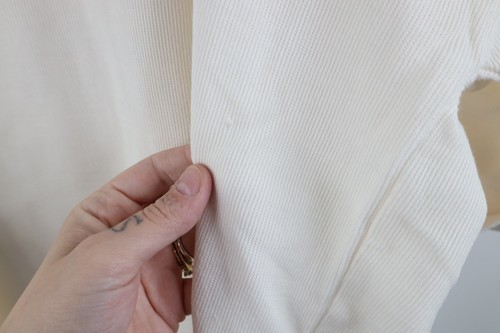 Blemishes, discoloring front. Loose threads collar. Collar, arms discolored. Yellowed. Pilling, fabric pulls. Sheer fabric. Stain on tag