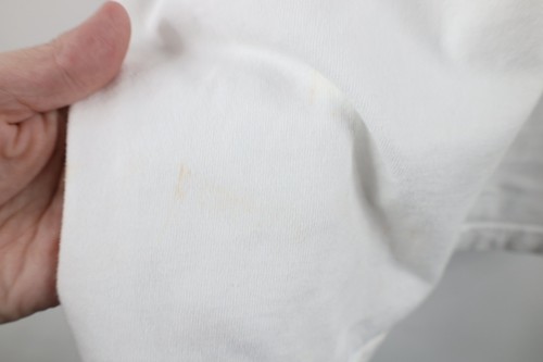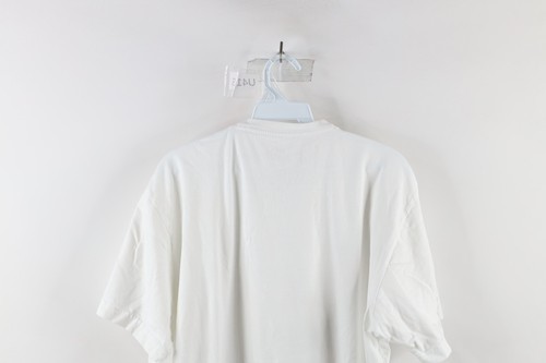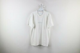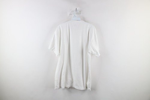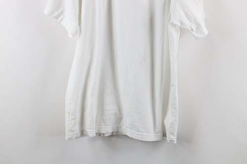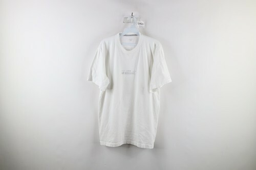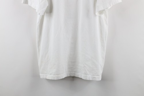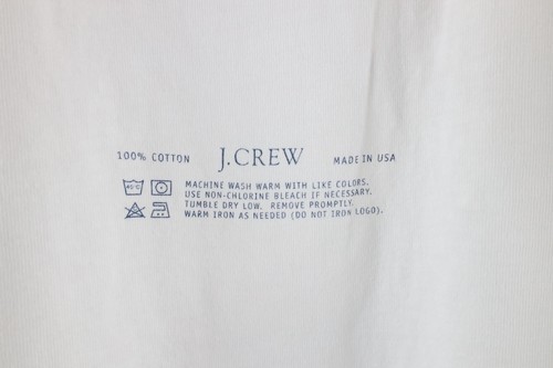 Vintage 90s J Crew Mens Medium Distressed Spell Out Care Label T-Shirt White USA