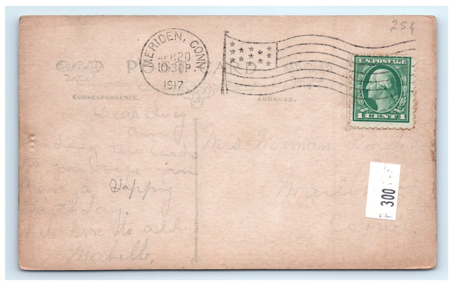 Postmarked in Meriden, Connecticut, in 1917, this original postcard offers a fascinating glimpse into the era's postcard culture and design. The one-cent George Washington stamp and the handwritten message on the back further emphasize its historical authenticity and collectible value. Measuring the standard postcard size of approximately 5.5 by 3.5 inches, this paper card remains a lovely example of early 1900s American printed ephemera, perfect for collectors of vintage greetings, floral art, or World War I-era memorabilia.