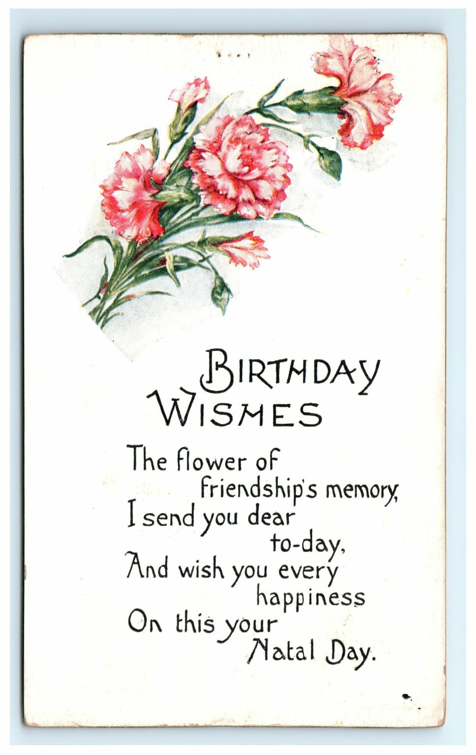 This charming vintage birthday postcard features a delicate bouquet of pink carnations, symbolizing friendship and affection, beautifully illustrated in a classic lithographic style. The card's sentiment reads, "Birthday Wishes - The flower of friendship's memory, I send you dear to-day, And wish you every happiness On this your Natal Day," capturing the timeless warmth of early 20th-century greetings. The lithograph printing technique with chrome features adds a subtle shine and depth to the floral artwork, enhancing its visual appeal.