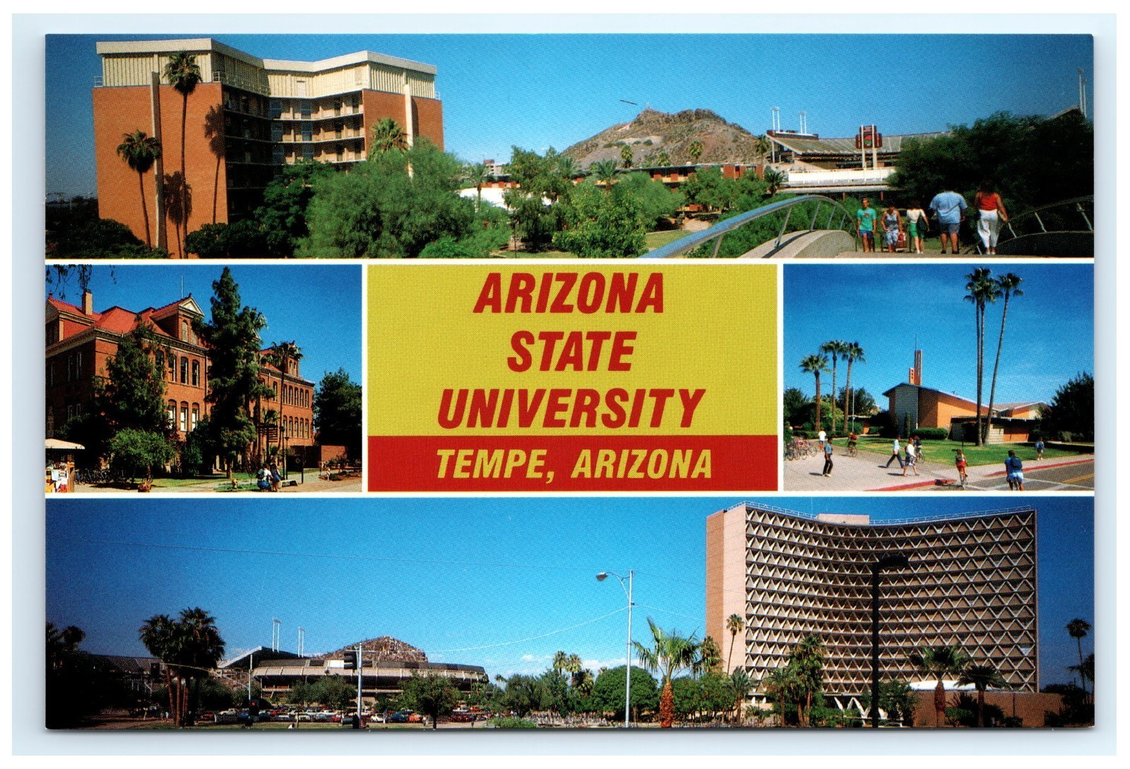 Celebrate the academic and architectural heritage of Tempe with this vintage Arizona State University postcard featuring landmarks such as Palo Verde Dorm, Old Main, the LDS Institute of Religion, and Manzanita Hall. This postcard captures a snapshot of campus life, showcasing the blend of historic and modern structures that define ASU?s dynamic environment. From the iconic red-brick charm of Old Main to the high-rise dorms that housed generations of students, each building represents a chapter in the university?s growth. Set against the desert backdrop of central Arizona, this image reflects both the tradition and transformation of one of the Southwest?s leading public universities.