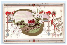This charming vintage Easter postcard features a quaint countryside cottage framed by delicate white flowers and ornate decorative elements, rendered in a beautiful lithograph print. The soft pastel color palette and intricate design details reflect early 20th-century printing techniques, highlighting the artistry typical of that era. The postcard's chrome finish adds a subtle sheen, enhancing the visual appeal and vintage charm.