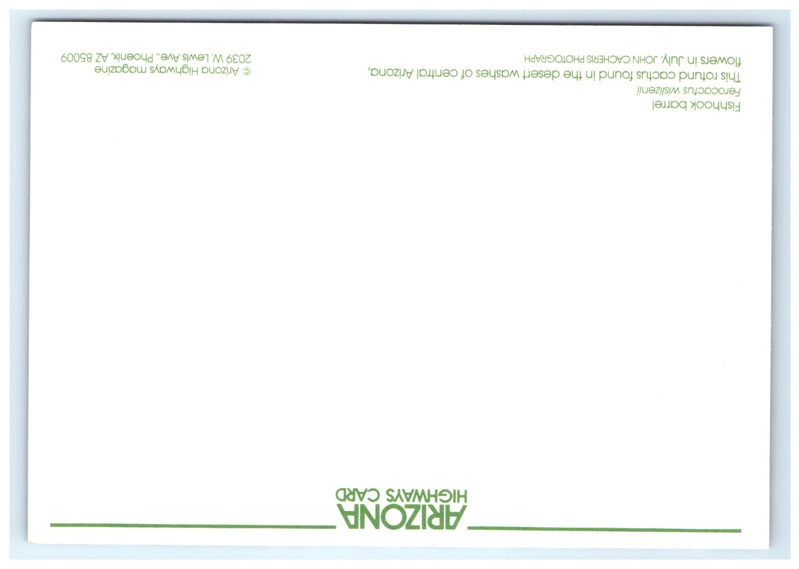 Fishhook Barrel Cactus Flower Blooming Arizona Postcard ? Southwestern Desert Wildflower View. This postcard features a close-up image of the vibrant blooming flower of the Fishhook Barrel Cactus, set against the iconic Arizona desert landscape. Showcasing the unique beauty of native desert flora, this card captures the colorful charm and natural environment of the Southwest. A vivid representation of Arizona?s distinctive cactus species in full bloom.