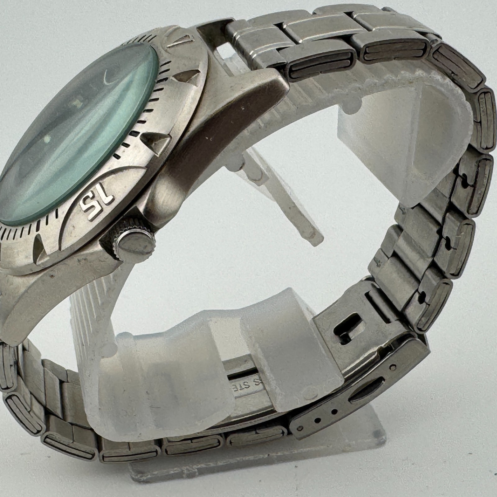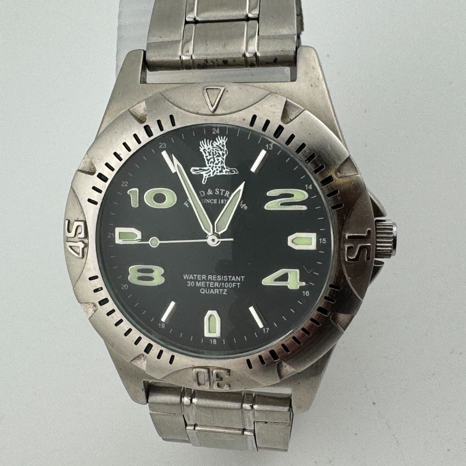 Field & Stream Quartz Watch Men 30m Silver Black Fixed Bezel New Battery 7.25"