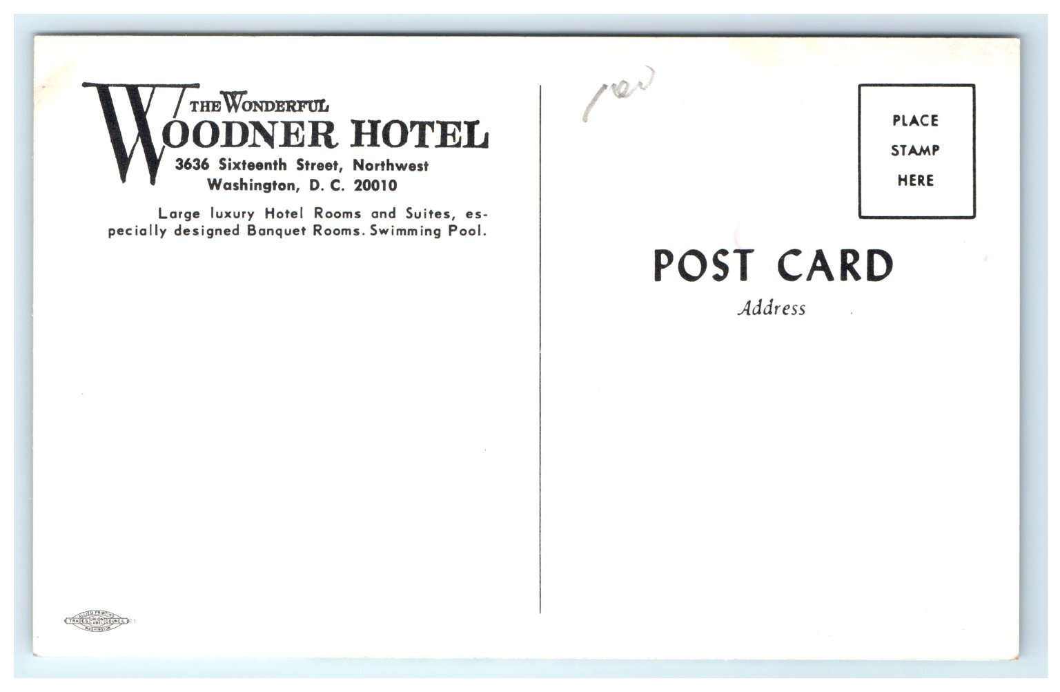 The Woodner Hotel was known for its large luxury rooms, suites, banquet facilities, and a swimming pool, making it a prominent landmark in Washington, D.C. Collectors and enthusiasts will appreciate this original printed postcard for its historical significance and the nostalgic glimpse it offers into the city's hospitality scene. The back of the postcard includes the hotel's address and promotional text, with clear divisions for message and address, typical of classic hotel advertising postcards.