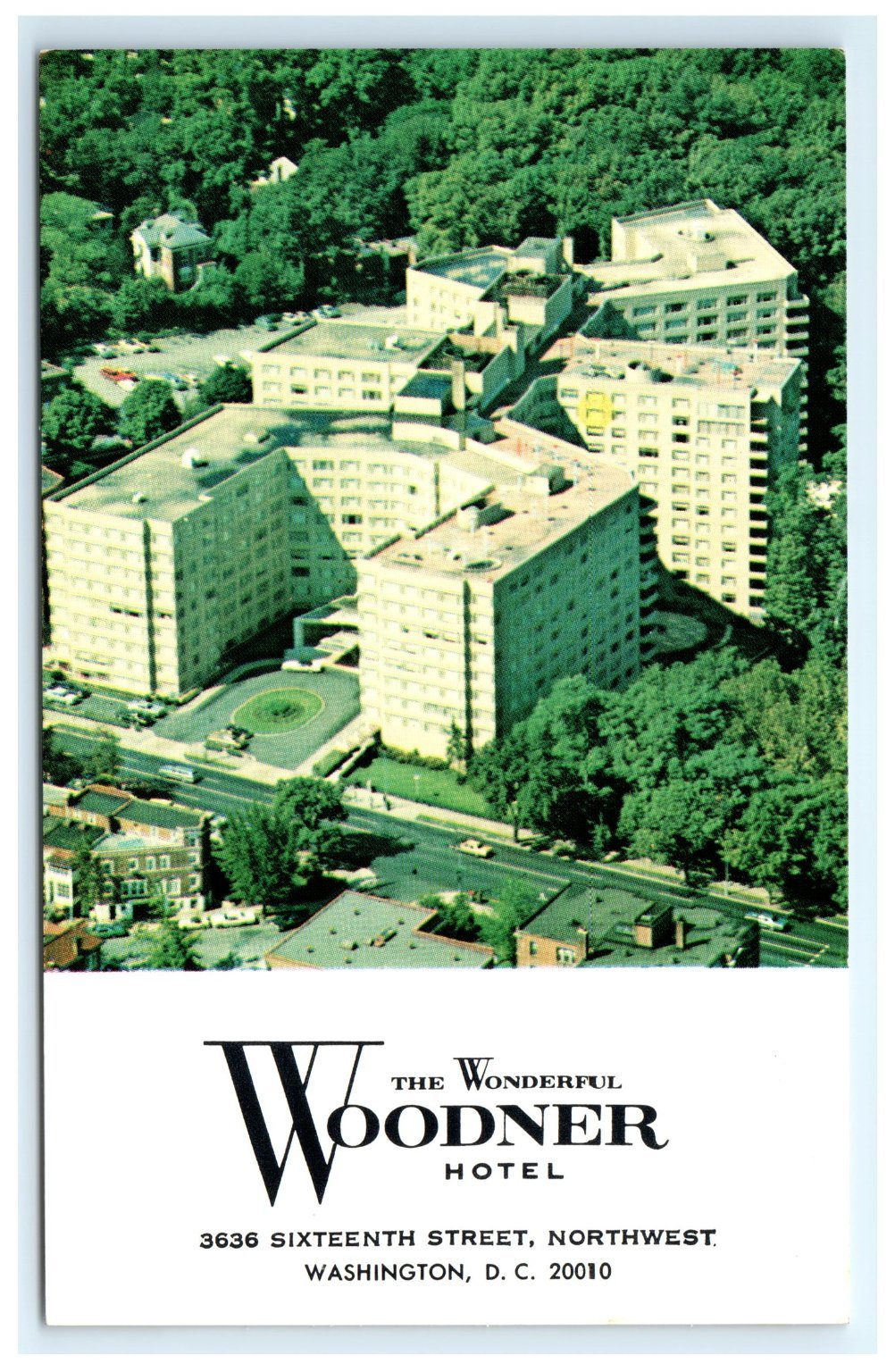 This vintage postcard features an aerial view of The Wonderful Woodner Hotel, located at 3636 Sixteenth Street, Northwest, Washington, D.C. The image showcases the hotel's distinctive multi-wing architecture surrounded by lush greenery, capturing the mid-20th century charm of this luxury hotel. Printed using a vibrant chrome lithograph process, the postcard presents vivid colors and sharp details characteristic of high-quality commercial postcards from the era.