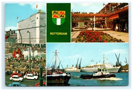 This original vintage lithograph postcard showcases iconic scenes from Rotterdam, Holland, including the prominent Euromast Tower, bustling city square with a Shell building, and the vibrant harbor filled with ships and cranes. The postcard captures mid-20th century architecture and urban life, reflecting Rotterdam's significance as a major European port city.