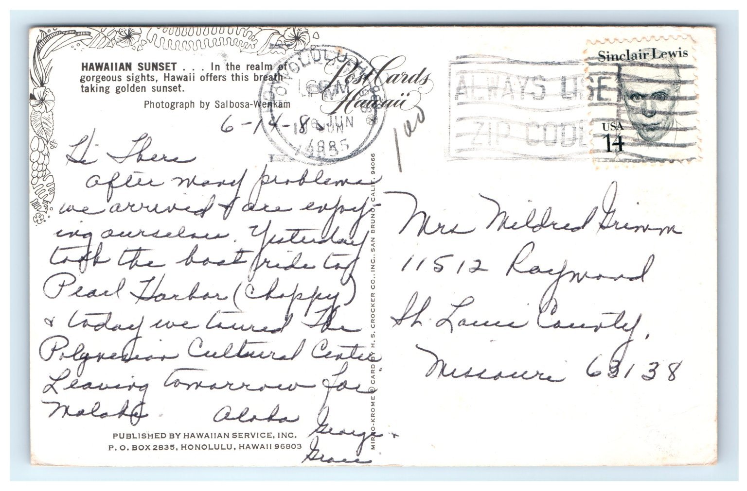 Published by Hawaiian Service, Inc. in Honolulu, Hawaii, this lithographed postcard uses the photographic work of Salbosa-Wenkam, adding historical and collectible value. The card is standard size (5.5 x 3.5 inches) and includes a handwritten message dated June 18, 1985, with a postmark from Honolulu. The stamp features Sinclair Lewis, adding a cultural touch to the mailed item. This postcard is an excellent collectible for enthusiasts of Hawaiian memorabilia, vintage postcards, or scenic sunset photography.