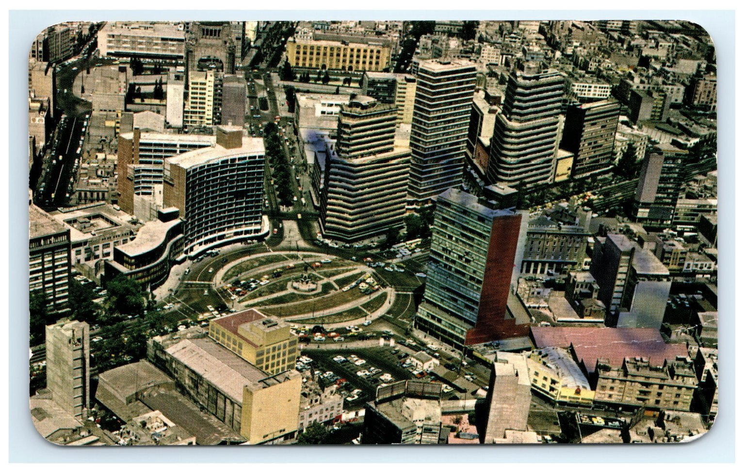 This vintage postcard features a vibrant aerial view of Glorieta Colon, also known as Columbus Circle, located in the heart of modern Mexico City, D.F. The image captures the iconic circular traffic roundabout surrounded by mid-century high-rise buildings, showcasing the urban landscape of Mexico City during the late 1960s. The postcard's lithograph printing and chrome finish enhance the vivid colors and details, making it a visually striking collectible.